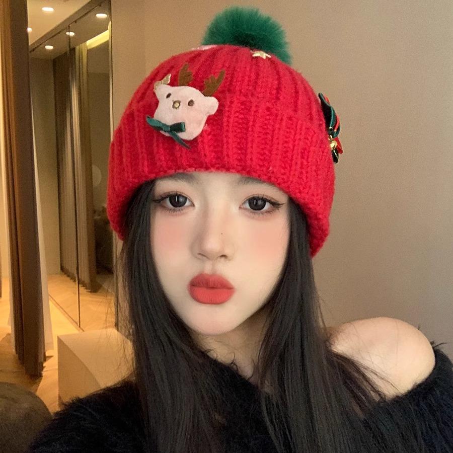 Красная Рождественская Шерстяная Шапка Осень и Зима Корейский Стиль Универсальная Подчеркивающая Маленькое Лицо Вязаная Шапка Большая Голова Теплая Шапка Женская