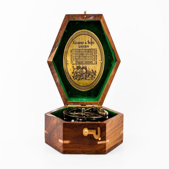 Этот навигационный прибор также является исключительным экземпляром для коллекционеров.. Винтажный латунный дизайн в сочетании с изящным деревянным корпусом придает ему классический шарм, который выделяется в любой коллекции морских инструментов.. Для тех, кто ценит морскую историю, компас Гилберта представляет собой как функциональный инструмент, так и произведение искусства.