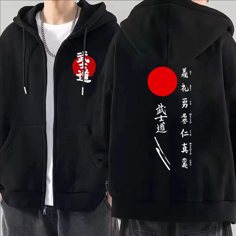 Мужская повседневная панк-куртка с капюшоном на молнии с принтом Бусидо, японская, модная в стиле ретро, осенне-зимняя, флисовые толстовки
