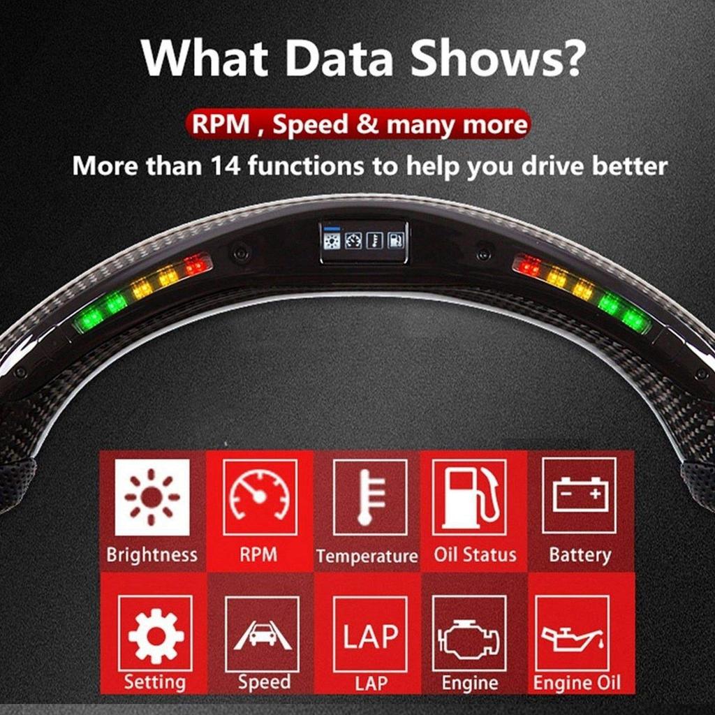 5 комплектов светодиодов: Пять наборов светодиодов с каждой стороны рулевого колеса постепенно загораются зеленым по мере увеличения оборотов двигателя.. При достижении заданных оборотов индикатор мигает красным в качестве напоминания о переключении вверх.. Регулируемый светодиодный индикатор переключения передач от 500 об/мин до 9900 об/мин и регулируемый цвет RGB-подсветки переключения.