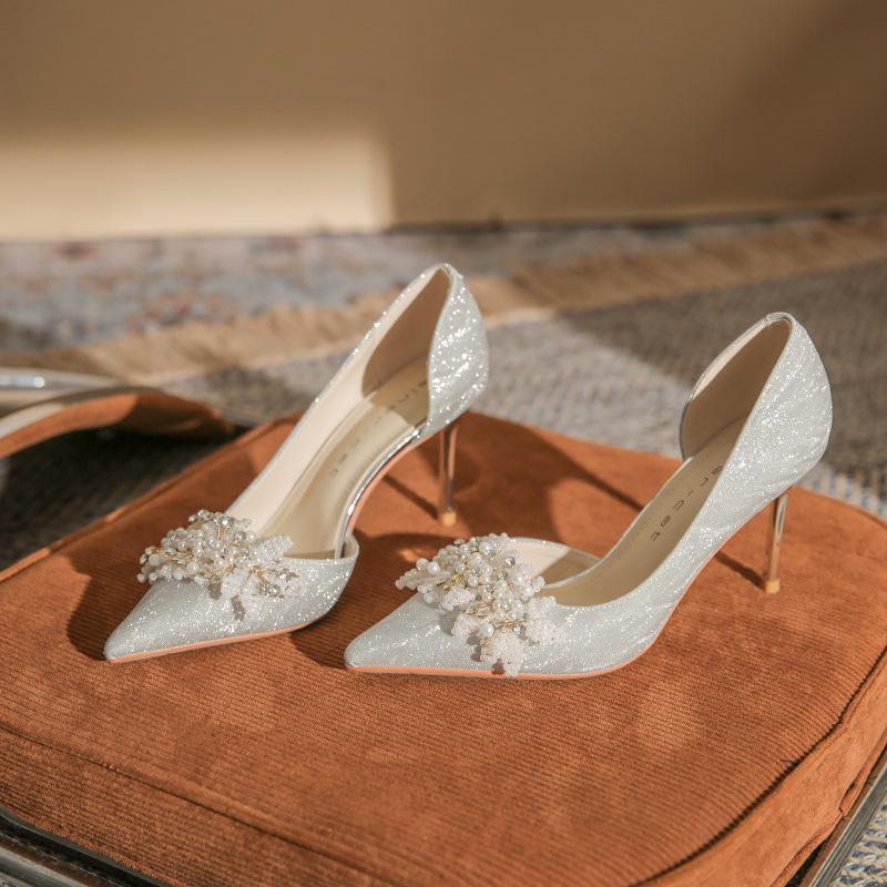 8335-2 Женские туфли на высоком каблуке стилет зима 2025 новые французский кристалл свадебные туфли с острым носком с открытыми боками свадебные туфли