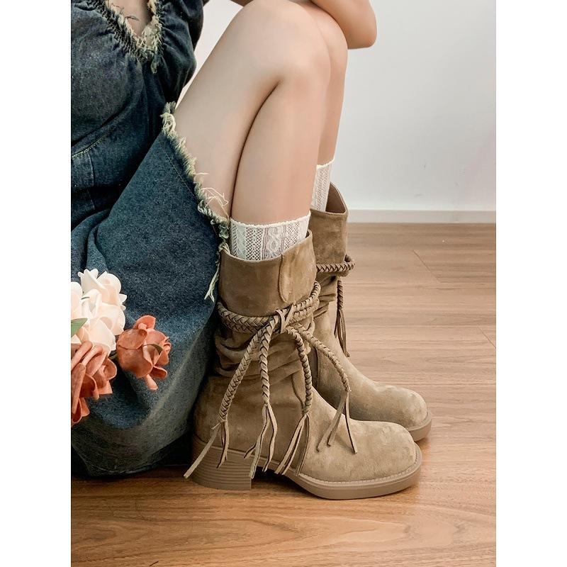 Версия из коровьей кожи~ ботинки на толстой подошве, ботинки рыцарского стиля в стиле ретро, женские замшевые ботильоны из натуральной кожи с бахромой и толстым каблуком из пеньковой веревки