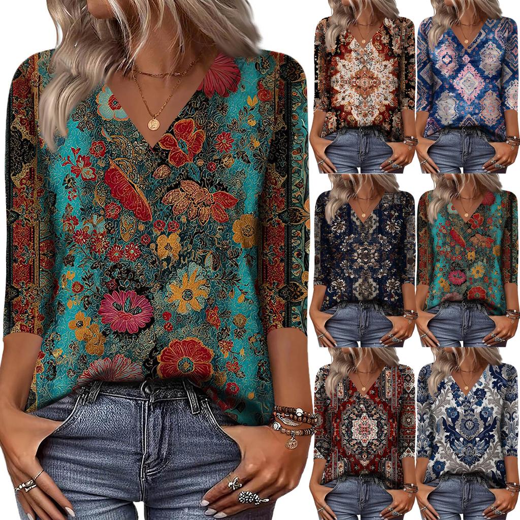 Женские рубашки с рукавом 3/4, топы с принтом и V-образным вырезом, повседневные топы, базовые футболки, блузки, свободные топы — купить товар онлайн с бесплатной доставкой по всему миру!