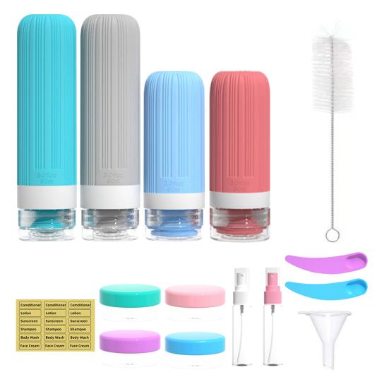 Наши удобные дорожные контейнеры многофункциональны и герметичны, в комплект входят 2 силиконовые бутылочки по 60 мл и 2 по 90 мл, а также 2 флакона-спрея для духов или тоников.. Каждая бутылка оснащена защитной крышкой для предотвращения протекания, что делает их незаменимыми для отпусков или круизов.. Эти стильные и портативные дорожные принадлежности долговечны и универсальны, подходят для гелей или ополаскивателей для рта.