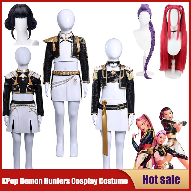 Аниме K-POP Охотники на демонов Дети Девочки Косплей Костюм Руми Зои Мира Детский Наряд для ролевых игр Вечеринка Черный Золотой Блестящая Униформа