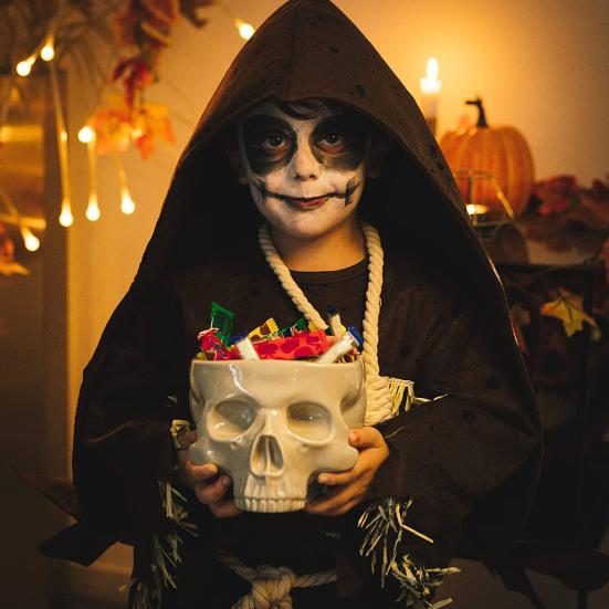 Захватывающая готическая атмосфера: Поднимите декор на Хэллоуин на новый уровень с этой захватывающей конфетницей в форме черепа! Будь то наполненный угощениями, закусками или пастой, его жуткий дизайн в виде черепа задает мрачный тон на вечеринках, за обеденными столами или в домашних барах.. Необходимая вещь для энтузиастов Хэллоуина, ищущих сочетание функциональности и леденящего стиля.