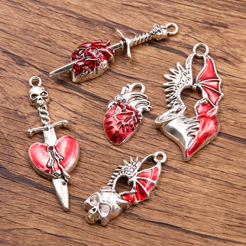 10 шт. Металлические подвески из сплава разных размеров, эмалированные, в виде полого сердца и черепа, красного цвета, для изготовления эмалированных браслетов, ожерелий и ювелирных изделий своими руками
