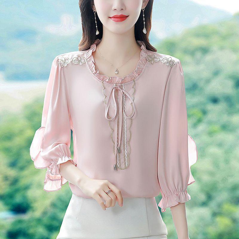 Весна Осень Рюши V-образный вырез Шнуровка Элегантная рубашка Женская рукав 3/4 Вышивка Однотонный пуловер Блузка Топ