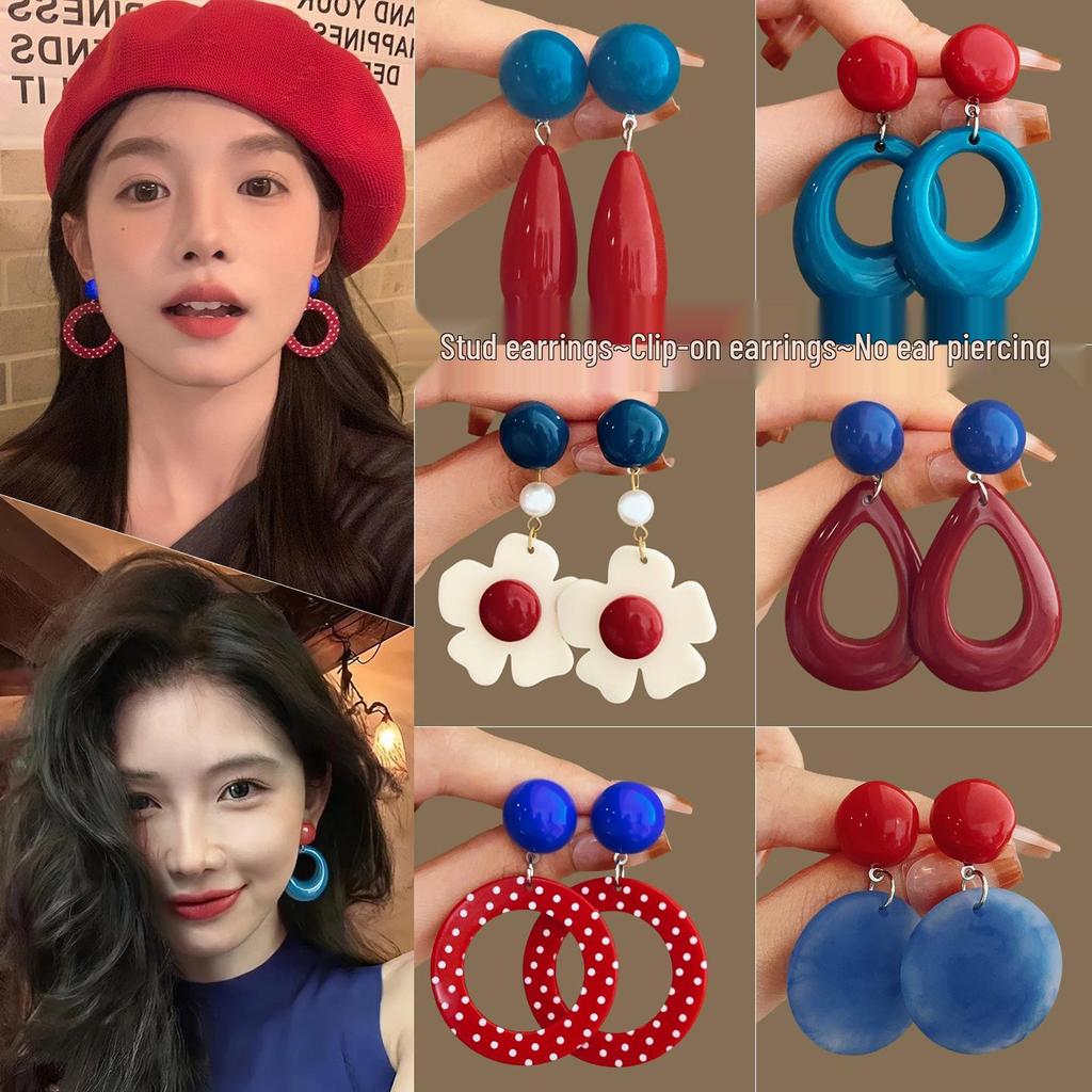 Серьги-клипсы в стиле 80-х в гонконгском стиле красного и синего цвета для непроколотых ушей – Высококлассные французские роскошные серьги-кольца