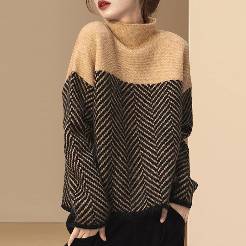 Вязаный свитер в стиле ретро с цветными блоками, полувысоким воротником, осенне-зимний, свободного ленивого кроя, пуловер