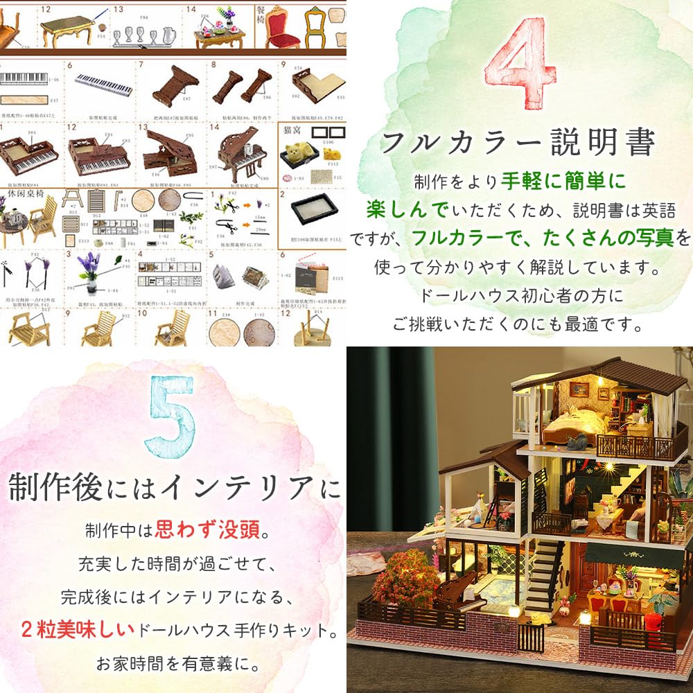 Этот продукт представляет собой набор для ручной работы по созданию миниатюрного кукольного домика.. Этот кукольный домик-вилла большого размера полон особенностей. От роскошной спальни на мансарде, гостиной и столовой, идеально подходящих для уютных посиделок, до террасы, утопающей в цветах, мебель и аксессуары тщательно проработаны до мельчайших деталей, и как только вы включаете свет, история начинает разворачиваться.