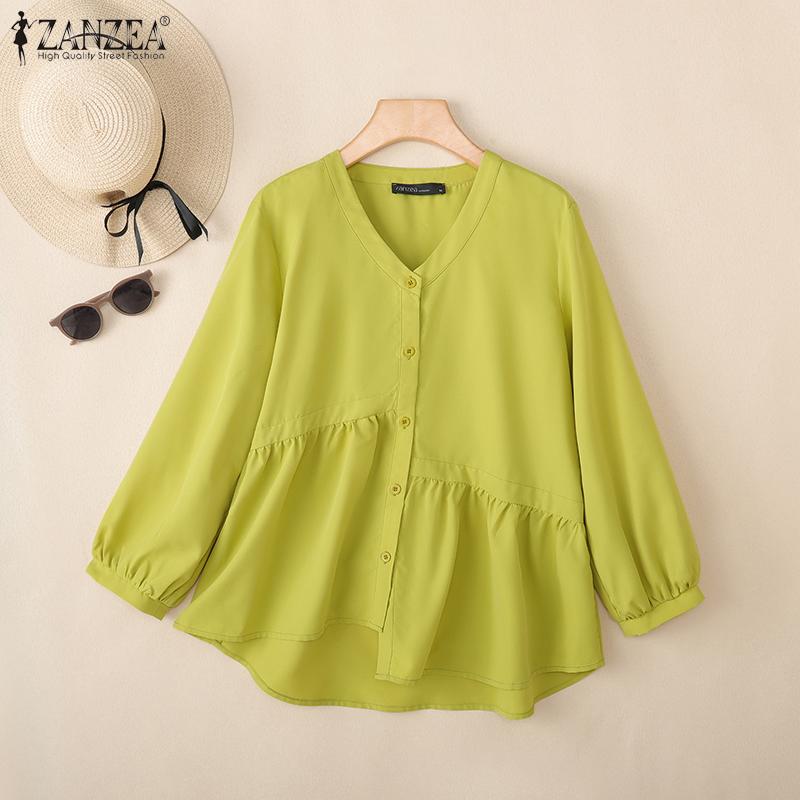 ZANZEA Женская повседневная однотонная свободная блузка с V-образным вырезом и длинным рукавом