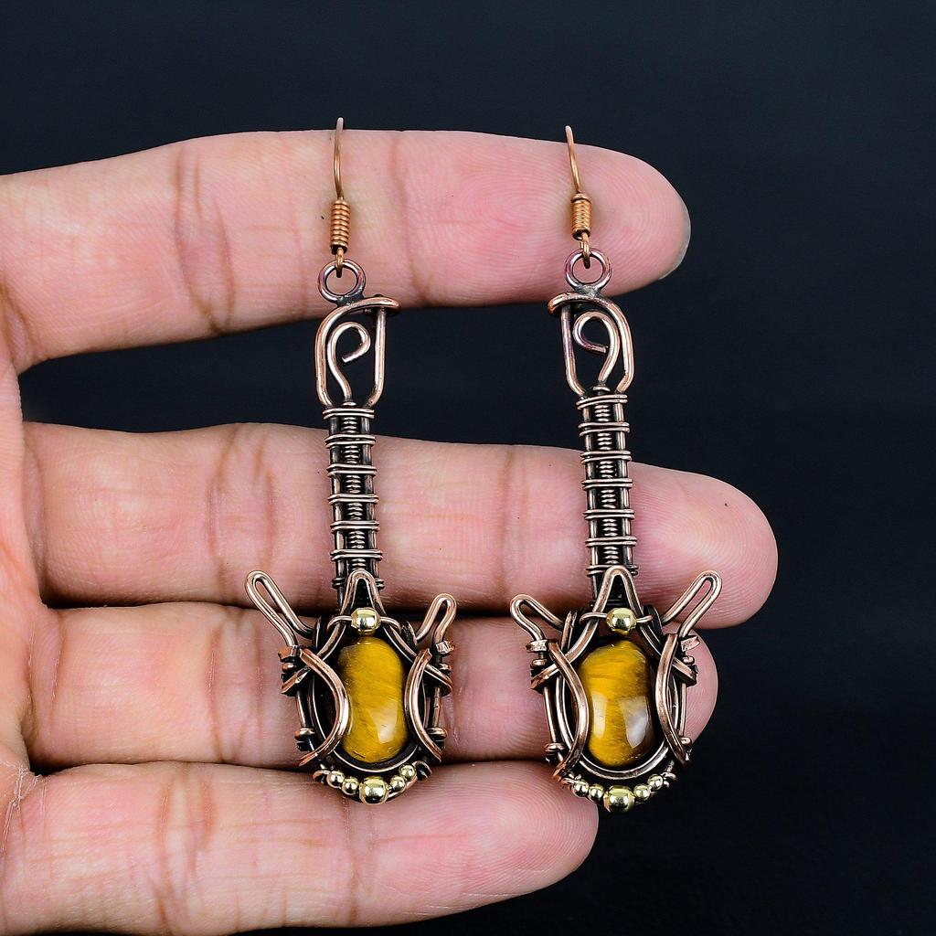 Tiger Eye 999 Copper Wire Wrapped Earrings, Handmade Gemstone Jewelry Earrings For Memorial Day — купить товар онлайн с бесплатной доставкой по всему миру!