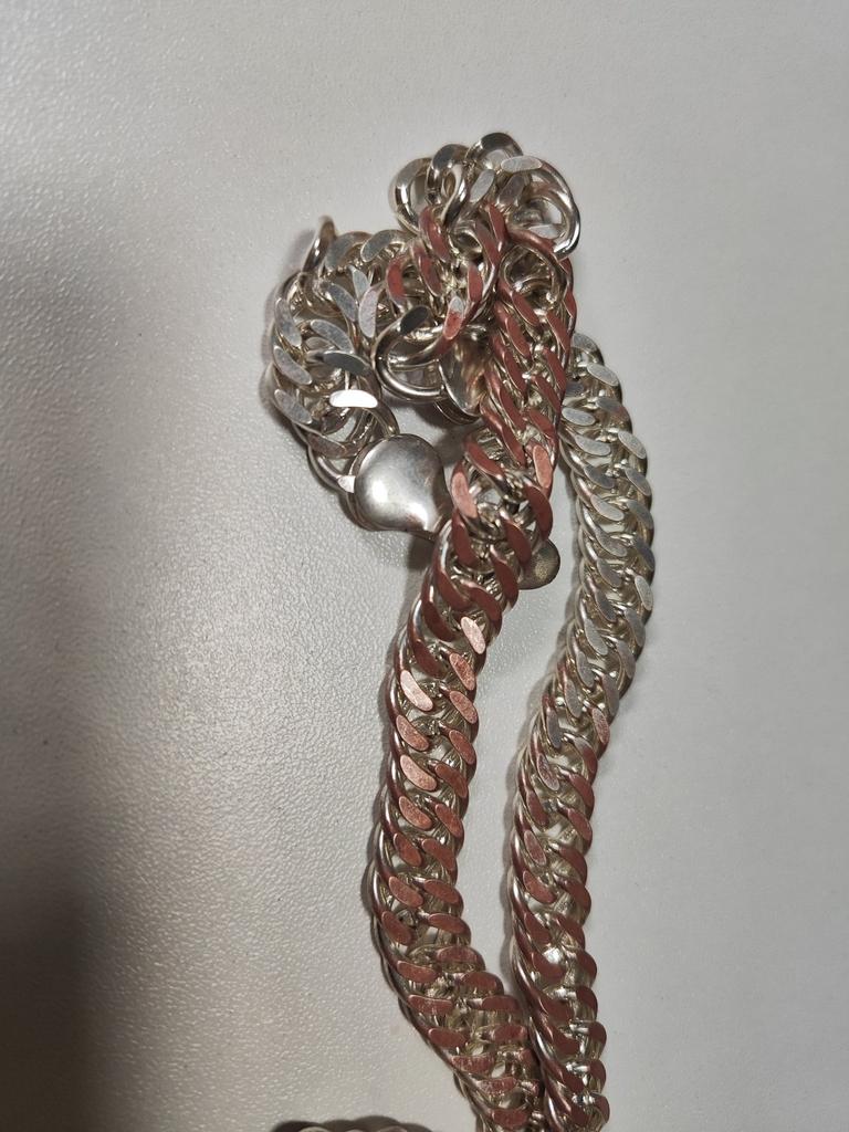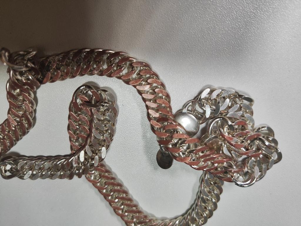 Тяжёлая толстая цепь, из 92,5℅ серебра и 7,5℅ другого металла. Очень ярко блестит.