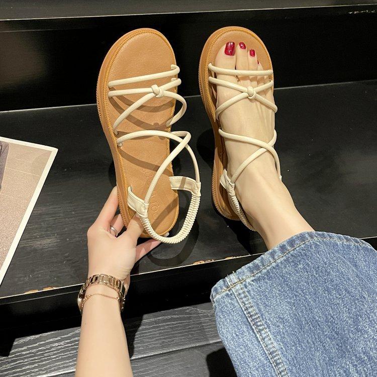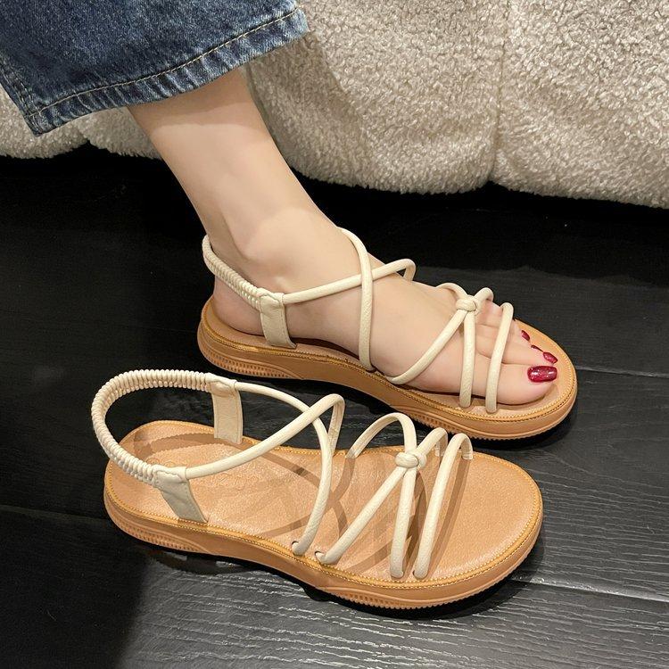 Fashion Comfort Shoes for Women Female Sandal Cross Soft 2025 Summer Strappy Heels Open Toe Girls Beach Flat Low Beige New Peep Elastic
