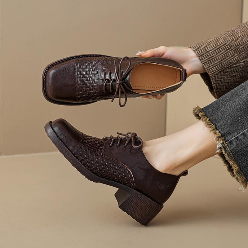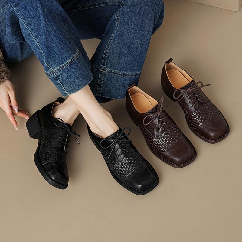 Мода НОВЫЕ Весенне-Осенние Женские Туфли Квадратный Носок Массивный Каблук Обувь Натуральная Кожаная Обувь для Женщин Ретро Плетение Шнуровка Женские Лоферы