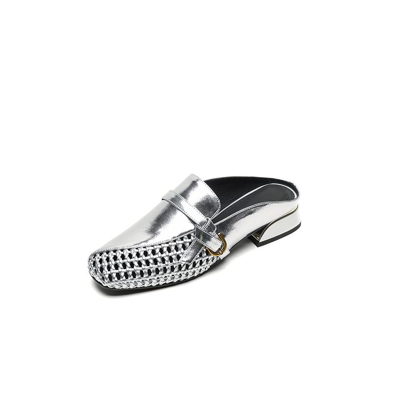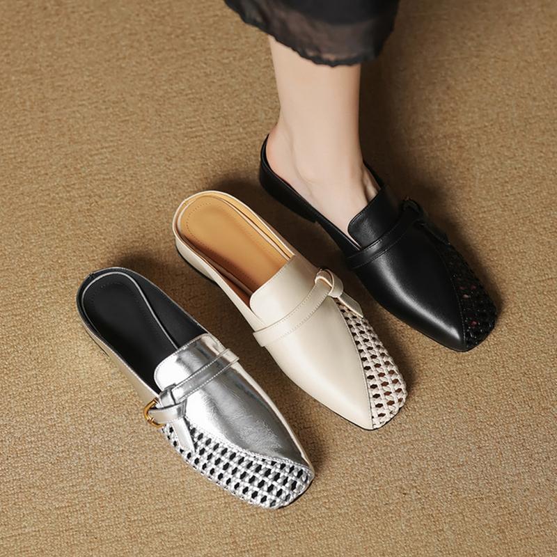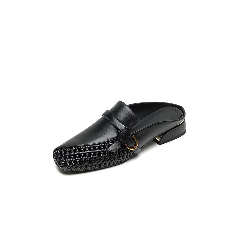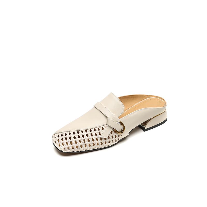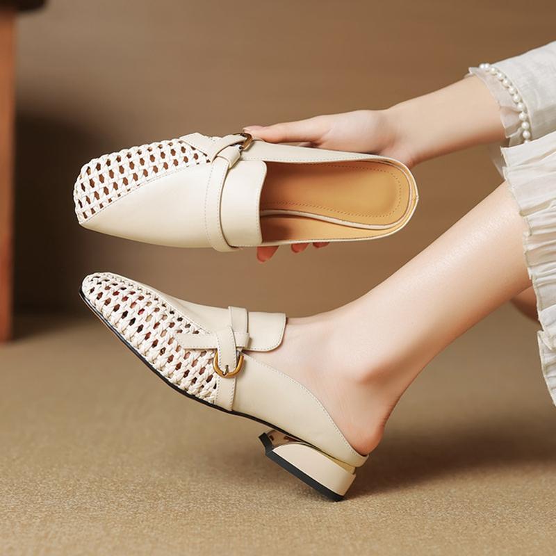 Мода НОВЫЕ Летние Женские Мюли Обувь из Натуральной Кожи для Женщин Квадратный Носок Массивный Каблук Обувь Закрытый Носок Сандалии Слингбэк Плетеные Шлепанцы