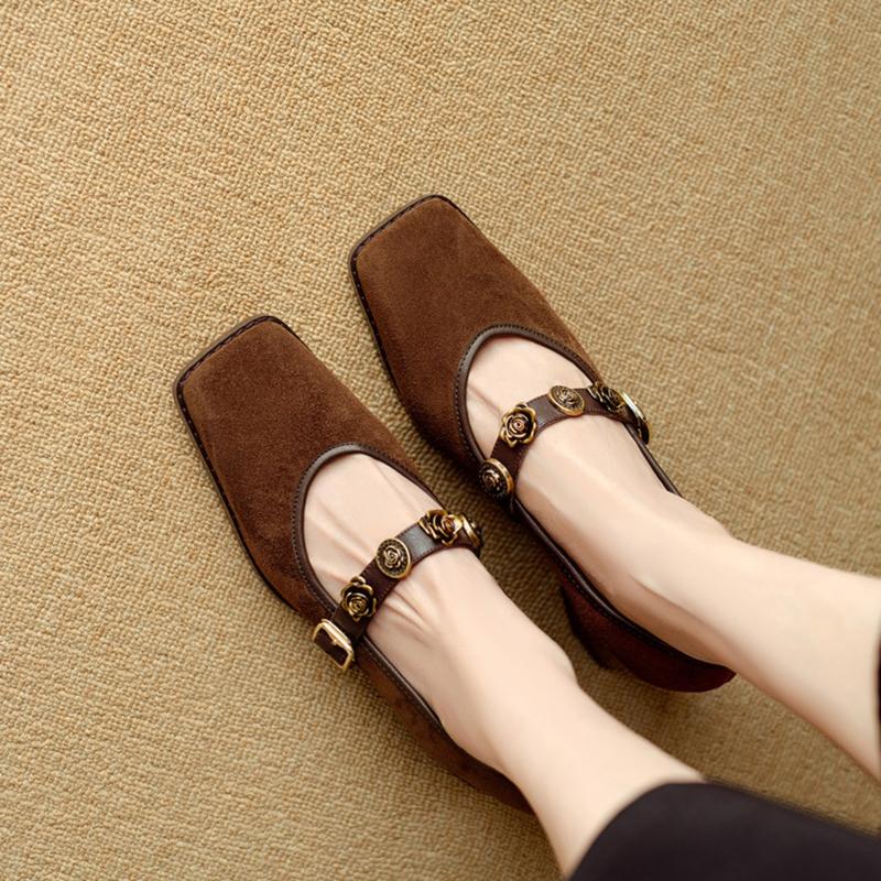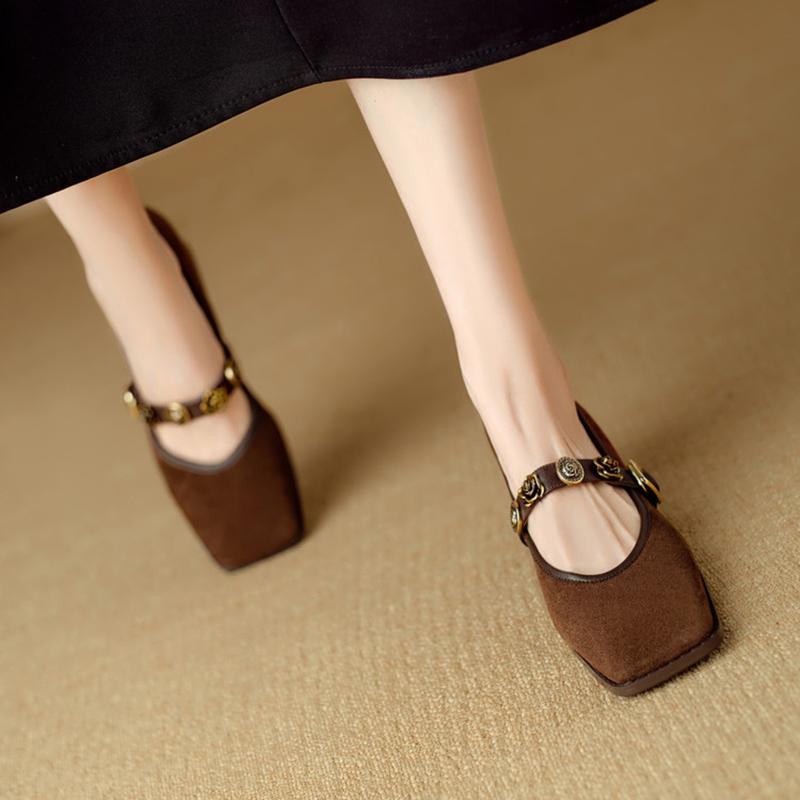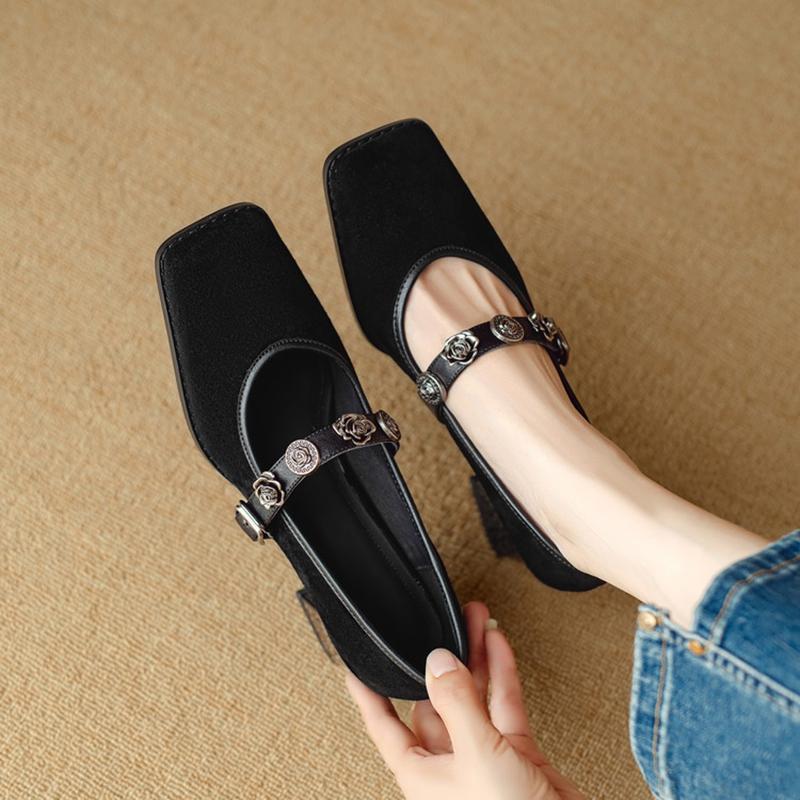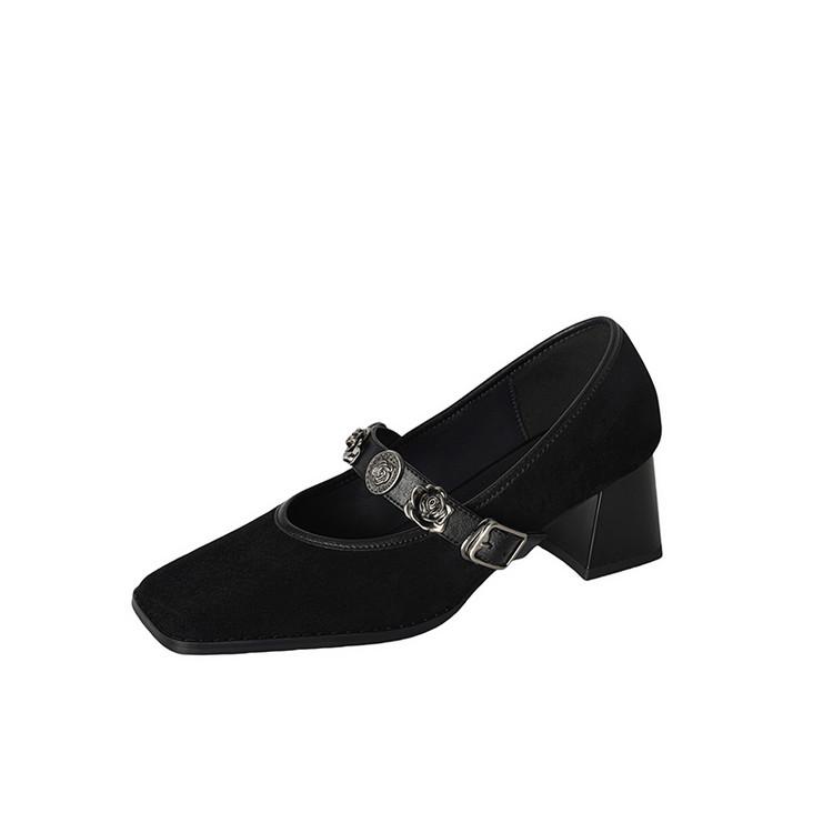 Fashion NEW Spring/Autumn Women Pumps Square Toe Chunky Heel Shoes Sheep Suede Leather Shoes for Women Slip-on Metal Buckle Strap Shoes
