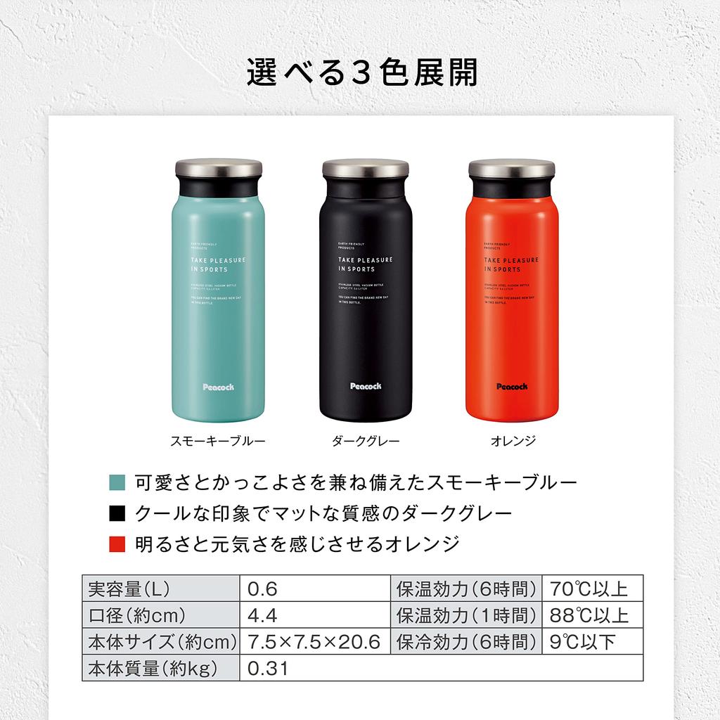 Peacock AMZ-61 HD Stainless Steel Water Bottle, Insulated for Hot and Cold Drinks, Dark Gray, 0.6L