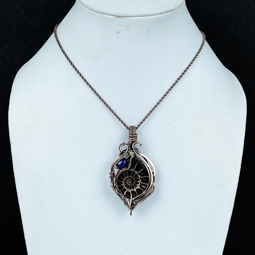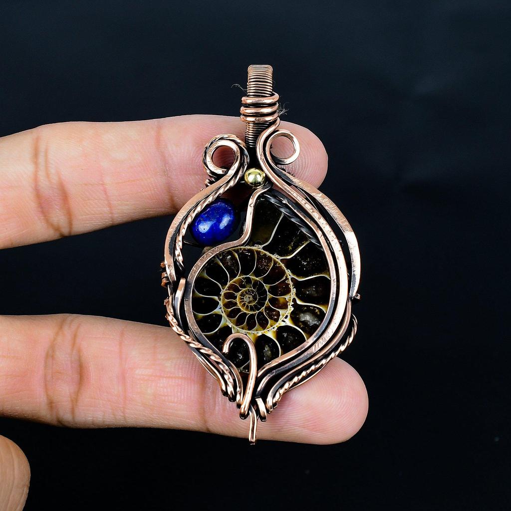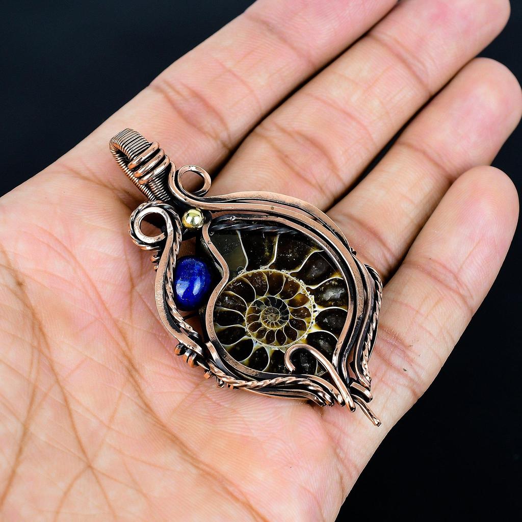 Ammonite Fossil & Lapis Lazuli 999 Copper Wire Wrapped Pendant, Handmade Gemstone Jewelry Pendant For Memorial Day