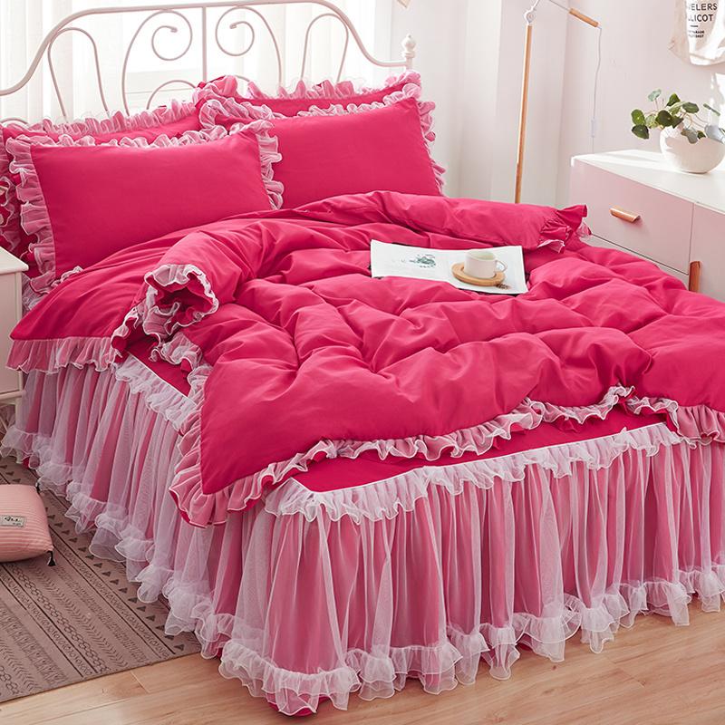 Принцесса Девочка розовое постельное белье юбка простыня с кружевом корейский однотонный покрывало наволочка декор спальня свадебное постельное белье для пары