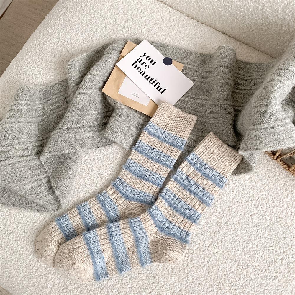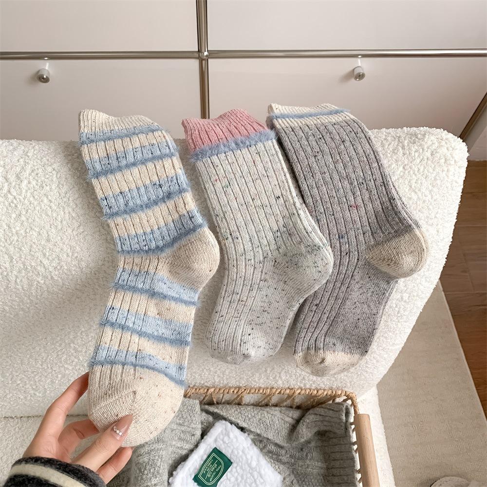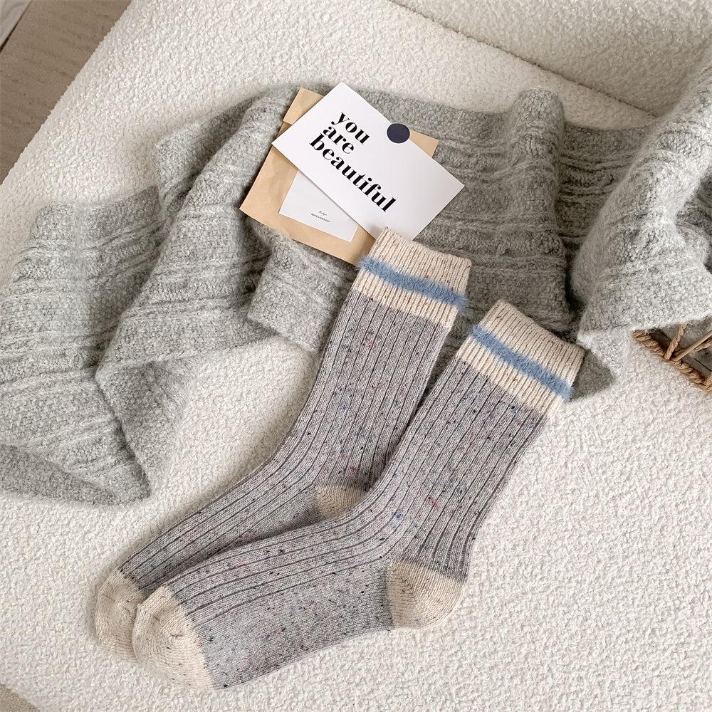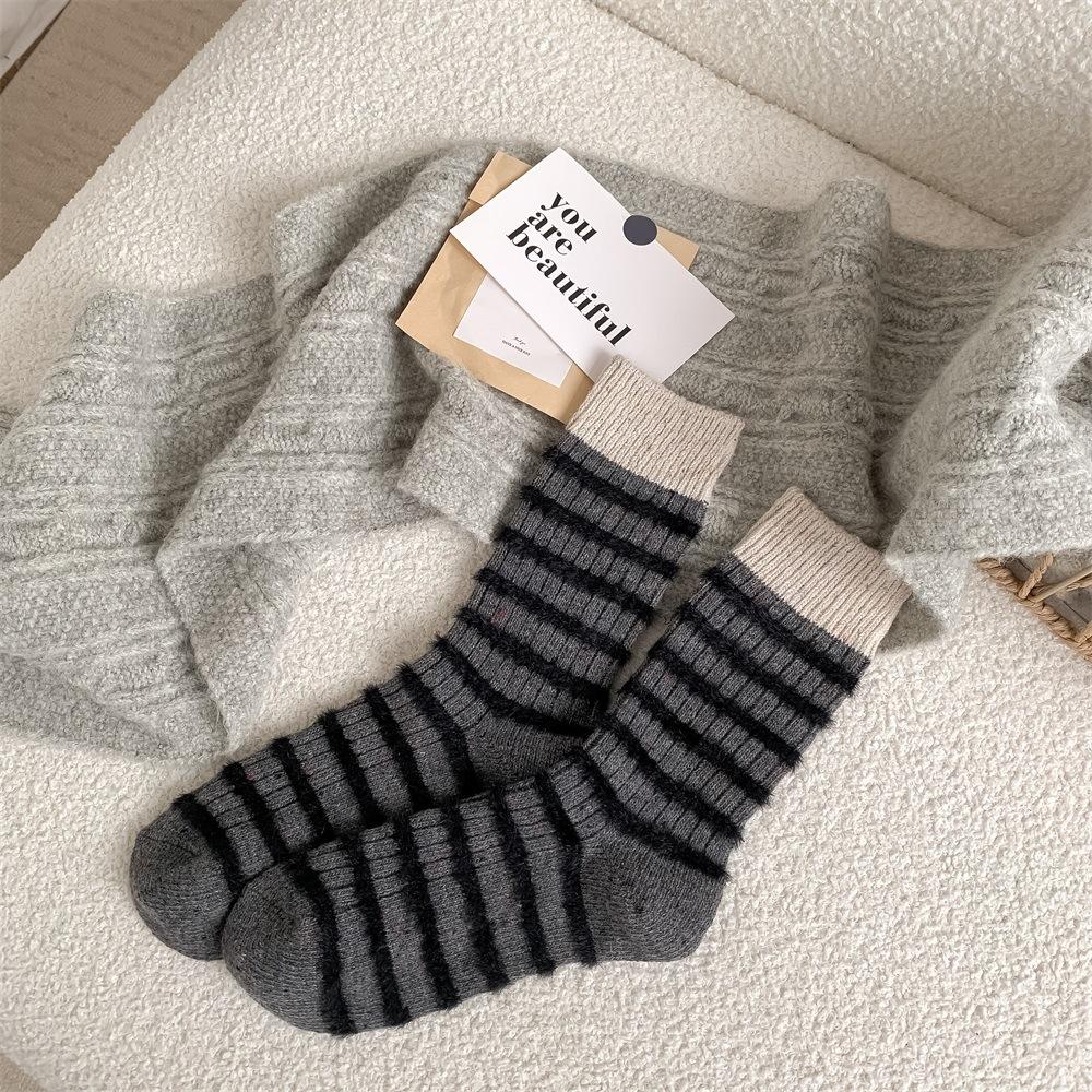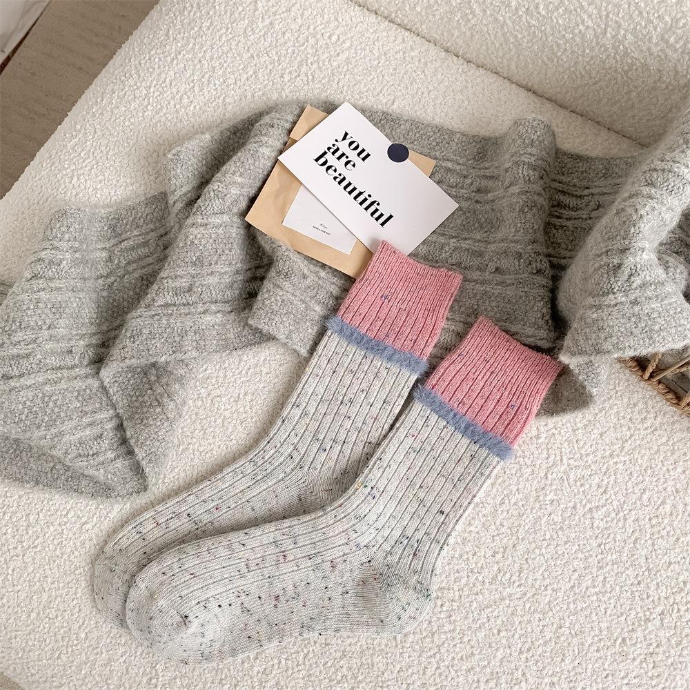 Зимние утепленные полосатые носки из шерстяной пряжи в горошек для женщин, контрастные цвета, мягкие и теплые, до середины икры.