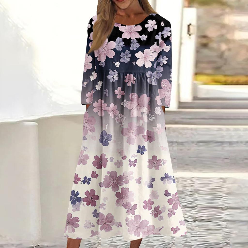 Женское повседневное миди-платье с круглым вырезом и цветочным принтом, с длинным рукавом и карманами