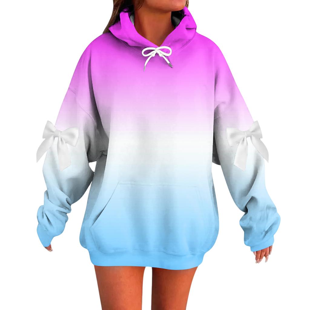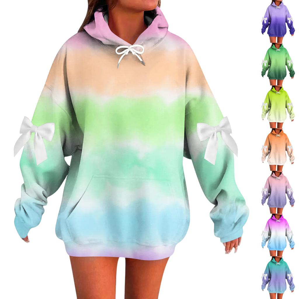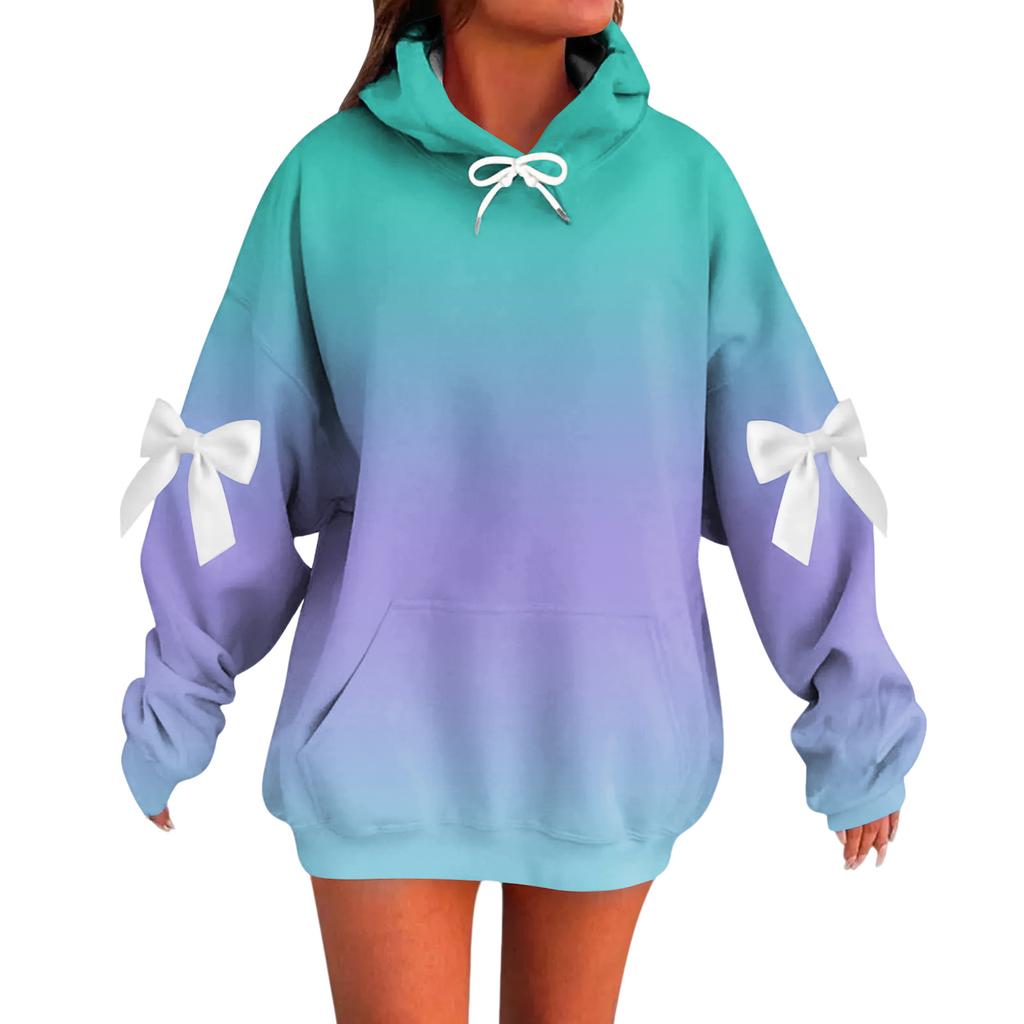 Женский градиентный принт, бант, длинный рукав, свободный крой, повязка на голову с веревочным капюшоном, толстовка-топ