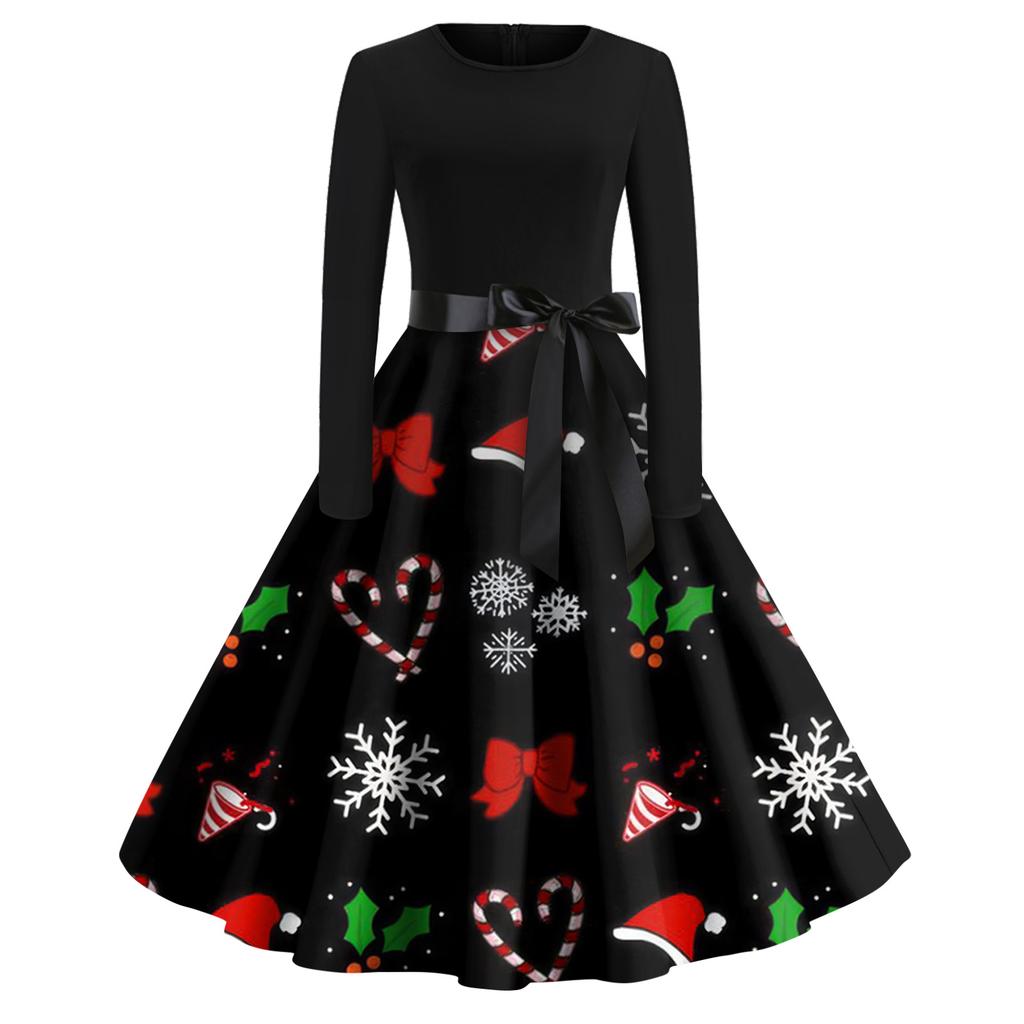 Рождественский принт расклешенное платье для женщин платье с длинным рукавом полые вечерние повседневные платья
