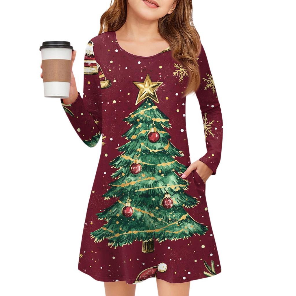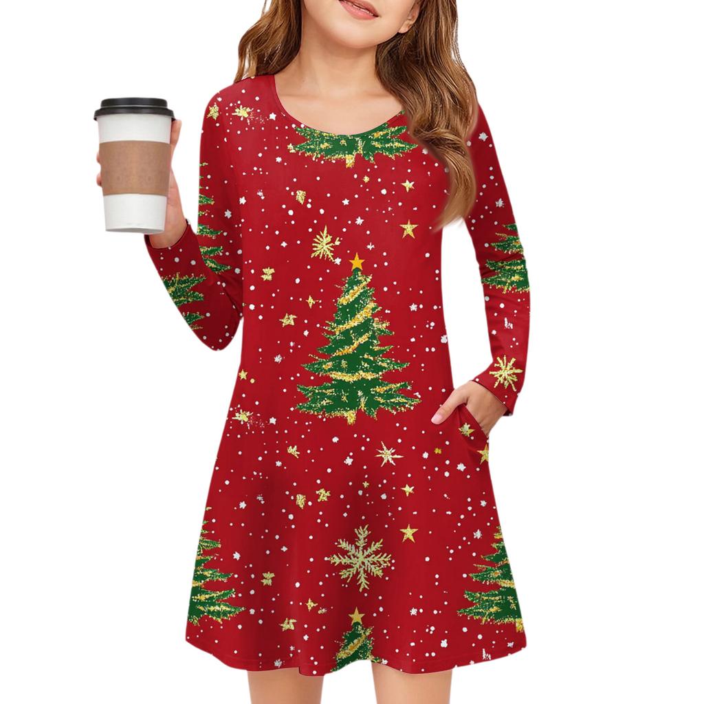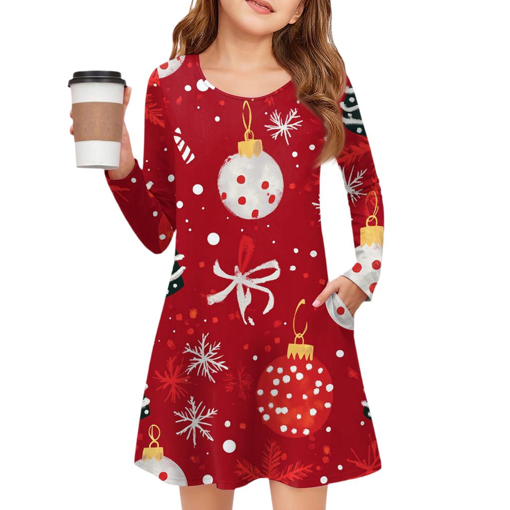 Рождественское платье с длинным рукавом для девочек - Платье с цветным карманом