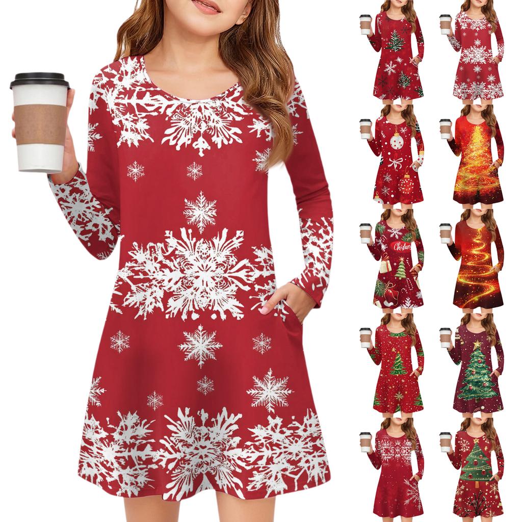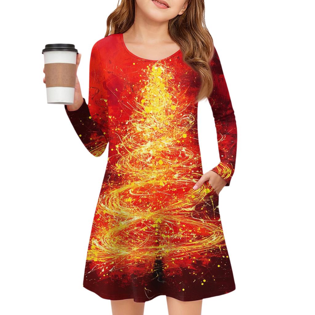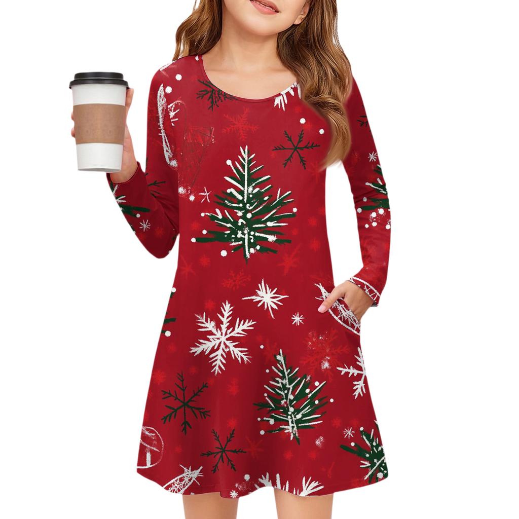 Рождественское платье с длинным рукавом для девочек - Платье с цветным карманом