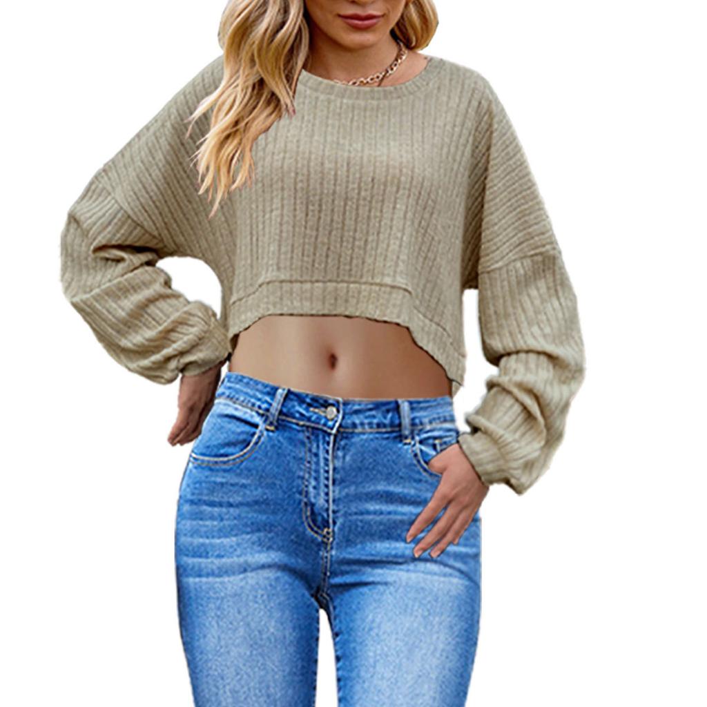 HNXC Осенне-зимняя женская одежда - это вязаный укороченный топ в рубчик с длинными рукавами и короткие футболки с начесом
