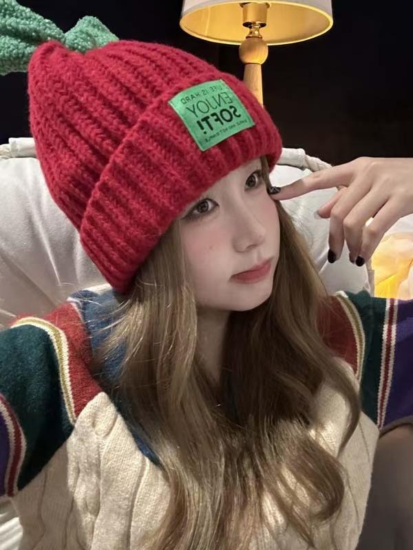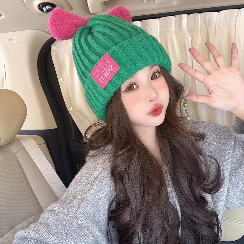 Осенне-зимняя шляпа-бини конфетных цветов с бантом для женщин, корейская версия, универсальная, подчеркивающая лицо, маленькая теплая вязаная шапка для студентов, милая шапка от холода