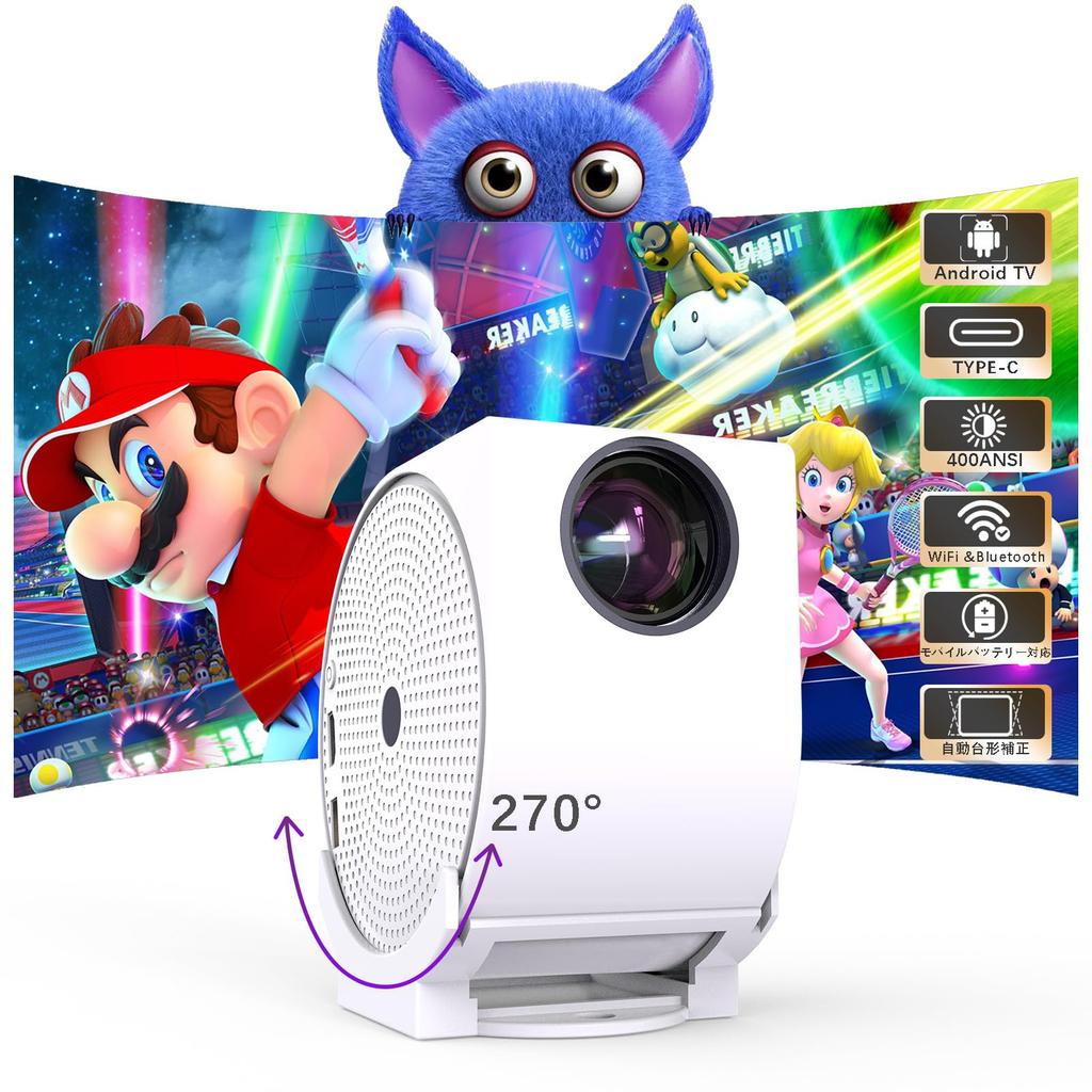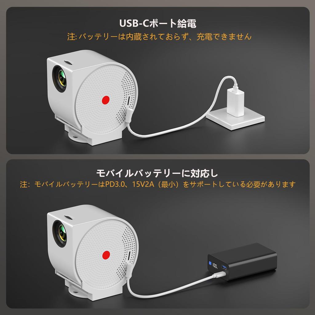 [USB-C, Вращение на 270°, Автоматическая коррекция трапецеидальных искажений, Совместимость с мобильными устройствами, Портативный] Проектор EGOBAS USB-C — первый проектор, поддерживающий питание Type-C, поддерживающий мобильные блоки питания PD мощностью 30 Вт и более и способный к 3 часам воспроизведения видео с аккумулятором емкостью 20 000 мАч. Размером всего 10x8 см и весом всего 0,5 кг, его легко носить в рюкзаке, что делает его идеальным для кемпинга.. Угол проекции можно свободно регулировать для проецирования на стену или потолок дома. Он также оснащен автоматической коррекцией трапецеидальных искажений, которая автоматически корректирует изображение, даже если проектор случайно переместить.. (уведомление: Для правильной работы автоматической коррекции трапецеидальных искажений проектор должен быть установлен под углом не более 45 градусов.) Для более плавной работы пульта дистанционного управления и во избежание задержек направляйте пульт непосредственно на порт Type-C проектора.