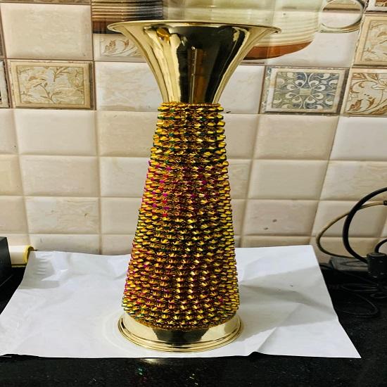 Улучшите свой домашний декор с помощью нашей изысканной вазы для цветов из латунных бусин, гармоничного сочетания традиционного мастерства и современного дизайна.. Эта декоративная настольная ваза высотой 38,1 см привлекает внимание замысловатой вышивкой бисером и вневременной привлекательностью.