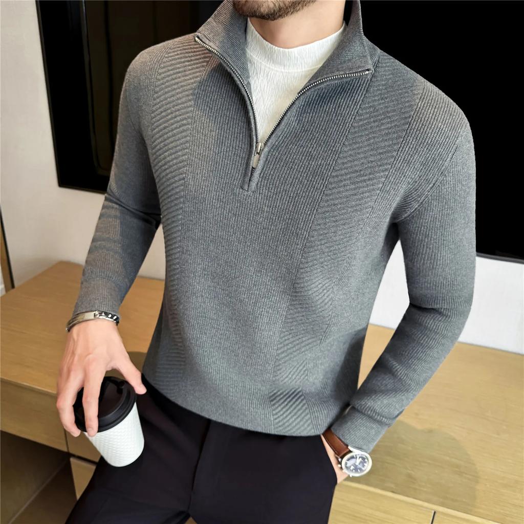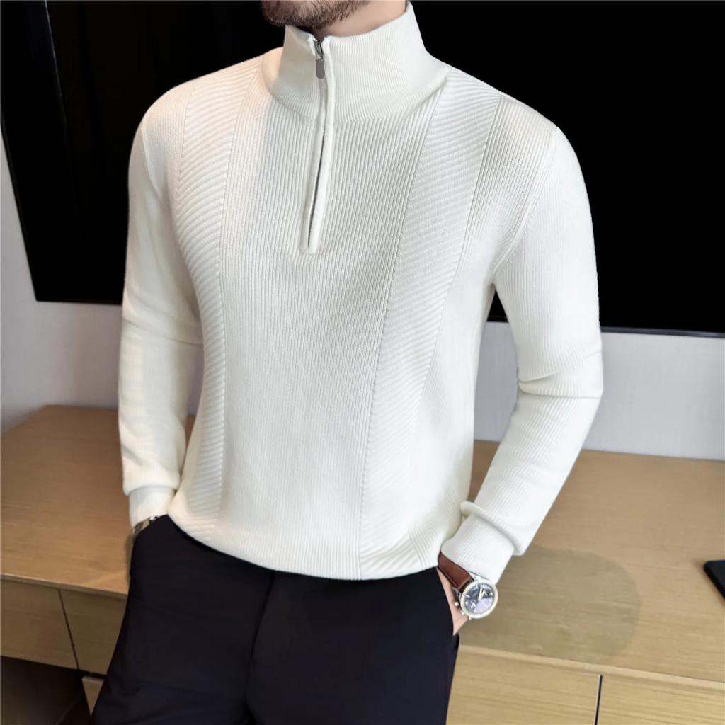 Осень Зима Толстые Полосатые Вязаные Пуловеры Мужская Мода Половина Молнии Высокое Качество Воротник-стойка Мужской Приталенный Теплый Вязаный Свитер