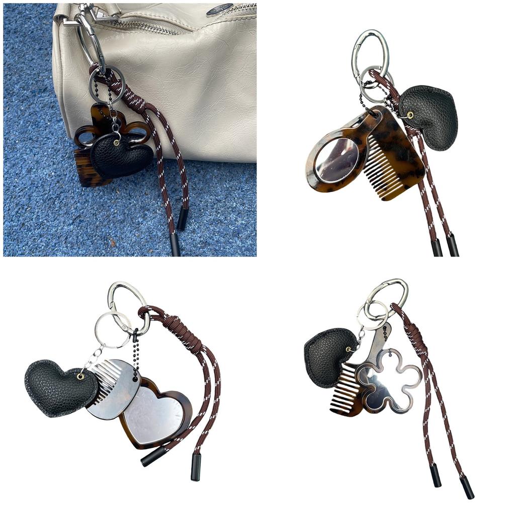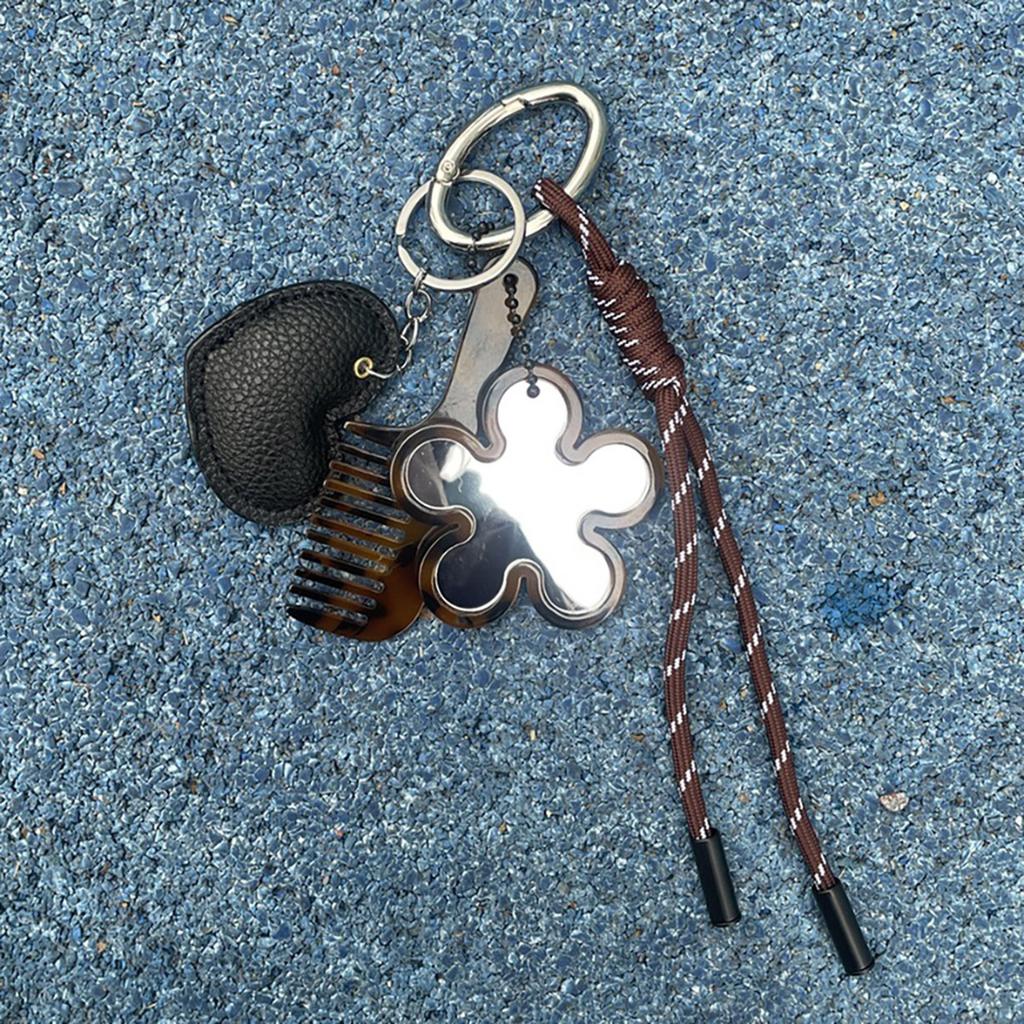 Этот многофункциональный брелок сочетает в себе портативную расческу, чистое зеркальце и прочный плетеный шнур для удобного ухода в дороге и организации ключей.