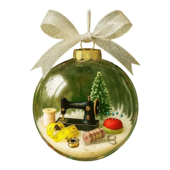 Внутри этого очаровательного украшения вы найдете миниатюрный мир, который порадует любого любителя шитья.. От старинной швейной машинки до красочных рулонов ткани, праздничной мини-елки и необходимых инструментов, таких как измерительная лента, подушечка для булавок, ножницы и катушки, — все это расположилось среди мерцающего белого глиттера.