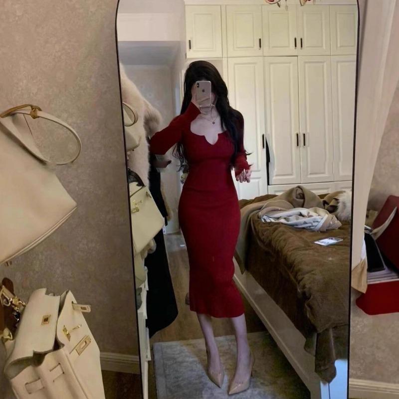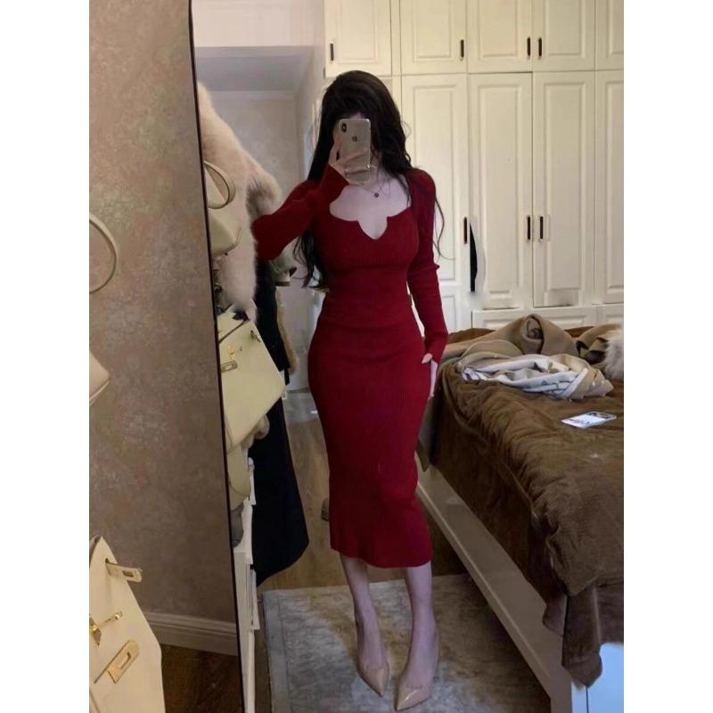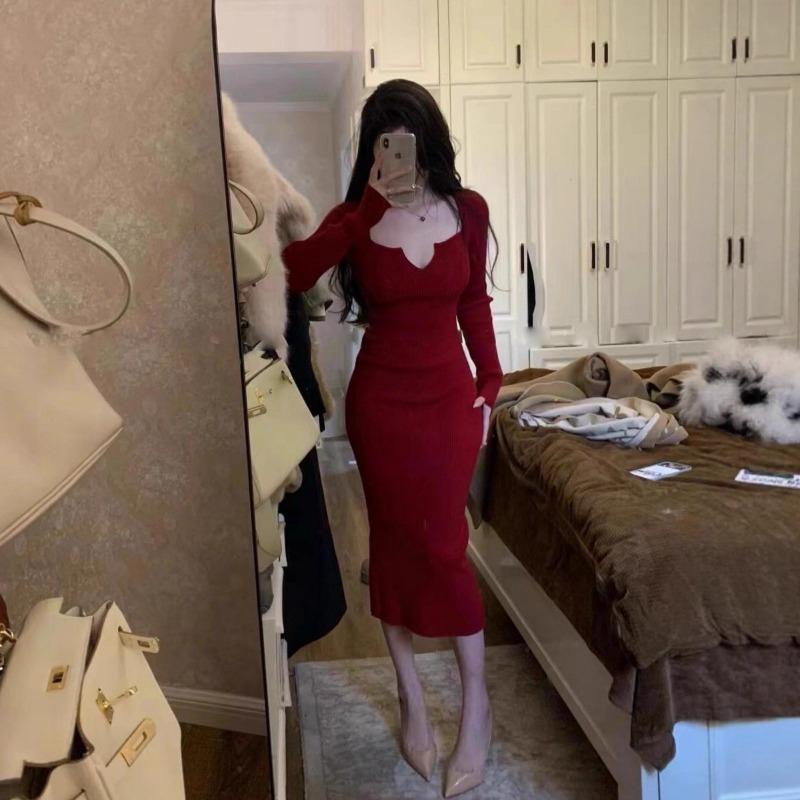 Темпераментное платье с квадратным вырезом, облегающее фигуру и с облегающей бедра юбкой, женская одежда, осенняя юбка миди и макси, вязаное платье-свитер