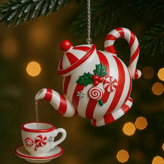Причудливый дизайн для наливания чая: Этот орнамент, выполненный в виде подвесного чайника и чайной чашки, создает причудливую иллюзию наливания чая в воздухе.. Украшенный рождественскими элементами, такими как листья падуба и красная смородина, он мгновенно усиливает праздничное очарование в любой обстановке.