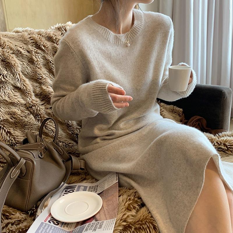 [] Длинная юбка-свитер женская осенне-зимняя свободная ленивая ветровка выше колена базовая с пальто вязаное платье