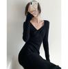 Retro autumn and winter oblique V-neck black long-sleeved knitted long skirt sexy hip skirt thickened slim dress