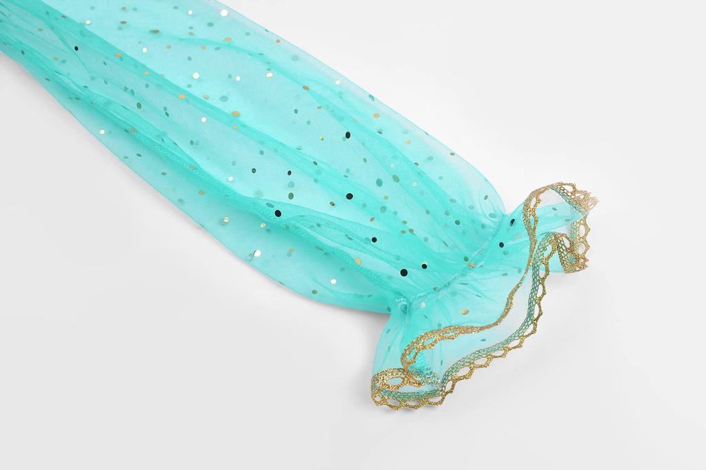 Этот костюм арабской принцессы выполнен в зелено-золотой цветовой гамме и украшен блестками и сверкающими пайетками для ослепительного вида.. Рукава и пояс брюк выполнены из эластичной шифоновой ткани, а умеренная прозрачность придает им очень благородный вид, что идеально соответствует образу экзотической принцессы.