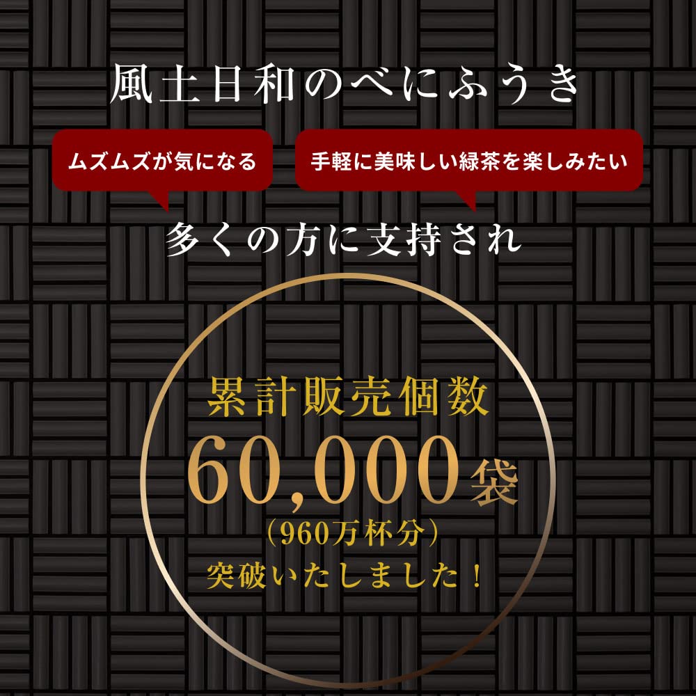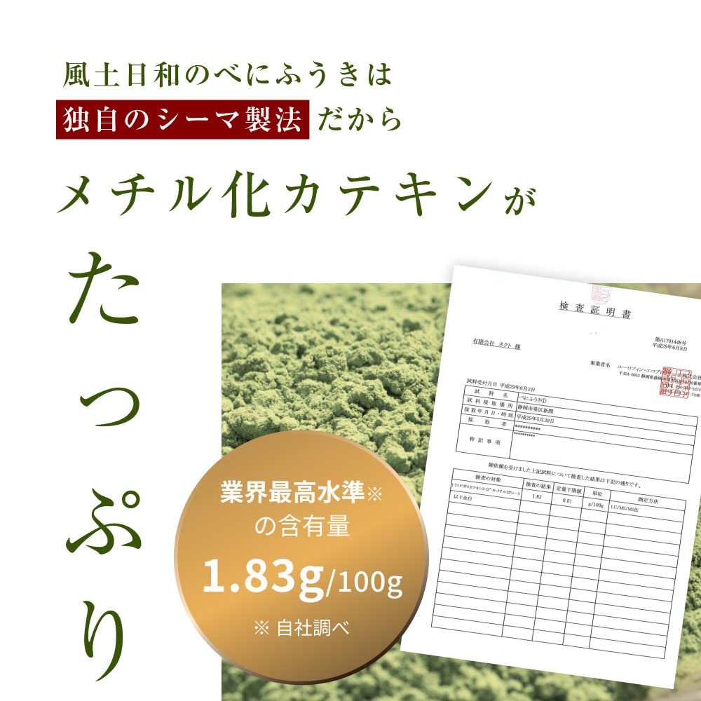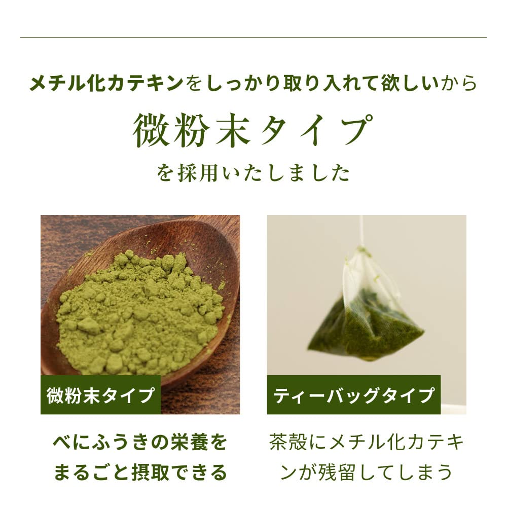 Японский зеленый чай Бенифуки от Фудобиёри производится внутри страны и содержит зеленый чай, один из суперпродуктов Японии, поэтому вы получаете не только метилированные катехины, но и обильные питательные вещества, содержащиеся в зеленом чае, такие как калий, кальций, магний, витамин С, витамин B2, витамин Е, фолиевая кислота, железо и бета-каротин.