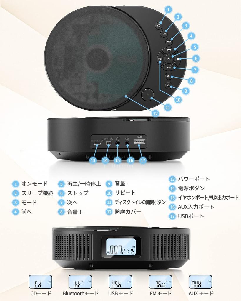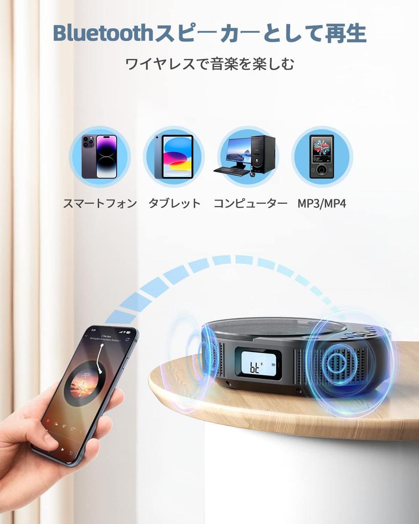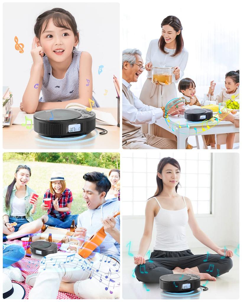 [CD-плеер с расширенной функциональностью] Этот портативный CD-плеер оснащен Bluetooth 5.0, что позволяет легко воспроизводить музыку, хранящуюся на устройствах с поддержкой Bluetooth, таких как смартфоны и ПК, по беспроводной сети.. Он также поддерживает FM-радио, позволяя вам принимать программы AM-радио на FM-частотах.. Легко переключайтесь между пятью режимами с помощью кнопки «MODE» на устройстве или пульте дистанционного управления: Режим Bluetooth, режим CD, режим FM, режим USB и режим AUX.