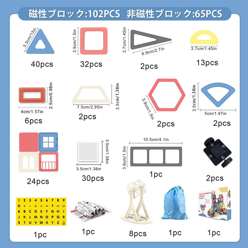 [Product Description] This toy comes with 167 blocks, including 40 equilateral triangles, 32 squares, 2 isosceles triangles, 13 semicircles, 6 rectangles, 2 trapezoids, 2 hexagons, 2 sectors, 30 white plates, 1 triangle, 2 wheels, 1 alphabet sticker, 1 easy-to-follow instruction manual, 8 Ferris wheel parts, 1 dedicated storage bag, and 24 remaining blocks. Beautiful in color and a convenient size, this attractive product will capture your child's attention and help develop dexterity through play, similar to building.