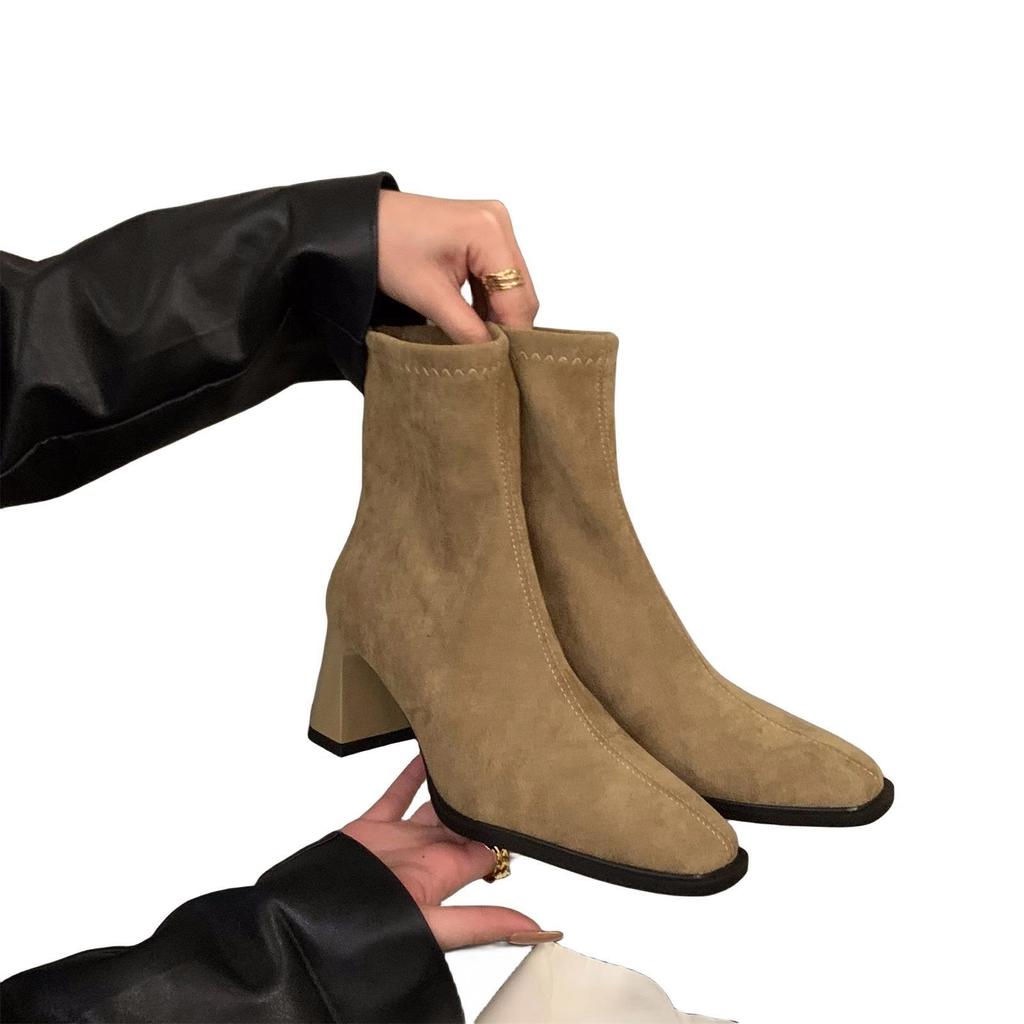 Zhike корейские ботильоны на высоком каблуке, замшевые ботинки Мартина, женская обувь 2025 новый осенне-зимний квадратный носок, тонкие короткие ботинки