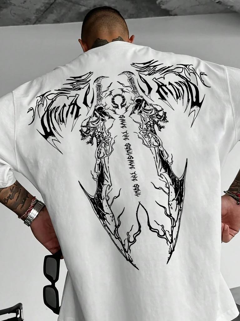 Мужская футболка с темным аниме-принтом Стильная уличная одежда Графическая футболка Дизайн с пламенем и мечами Повседневная футболка с круглым вырезом и коротким рукавом Летняя