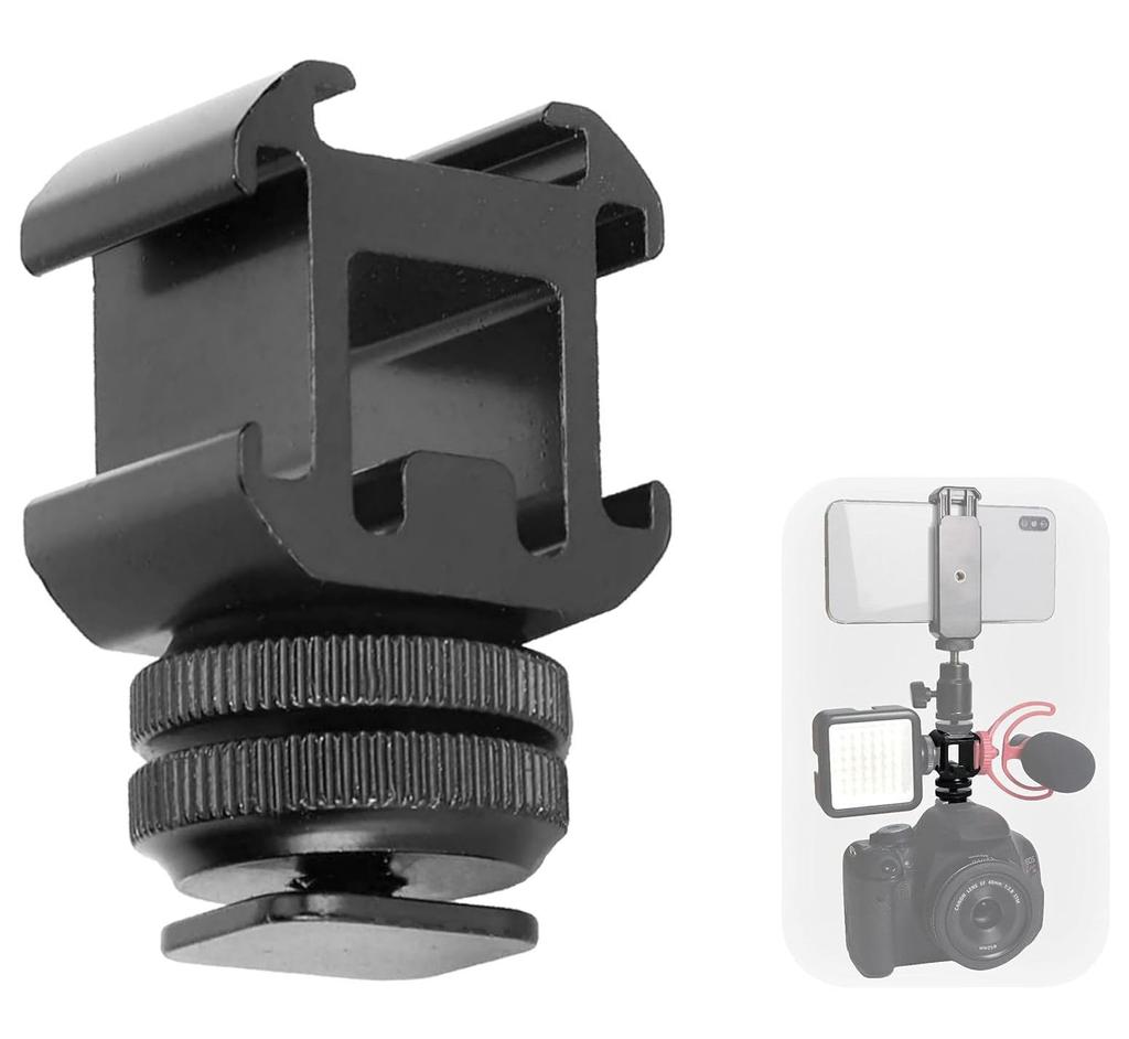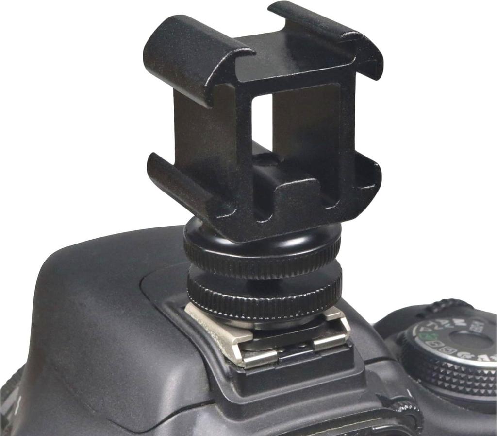 Резьба адаптера крепления «горячий башмак» универсальная 1/4" (1/4 дюйма) тип. Этот переходник для преобразования винта позволяет подключать вспышечное оборудование без крепления-клипсы и совместимые аксессуары к горячему башмаку.. Тип с двойной фиксацией позволяет надежно закрепить его как со стороны камеры, так и со стороны оборудования.. Его можно подключить к горячему башмаку зеркальной или беззеркальной камеры, а адаптер с 3 холодными башмаками можно прикрепить непосредственно сверху.. Его можно легко установить, эксплуатировать и регулировать без инструментов.