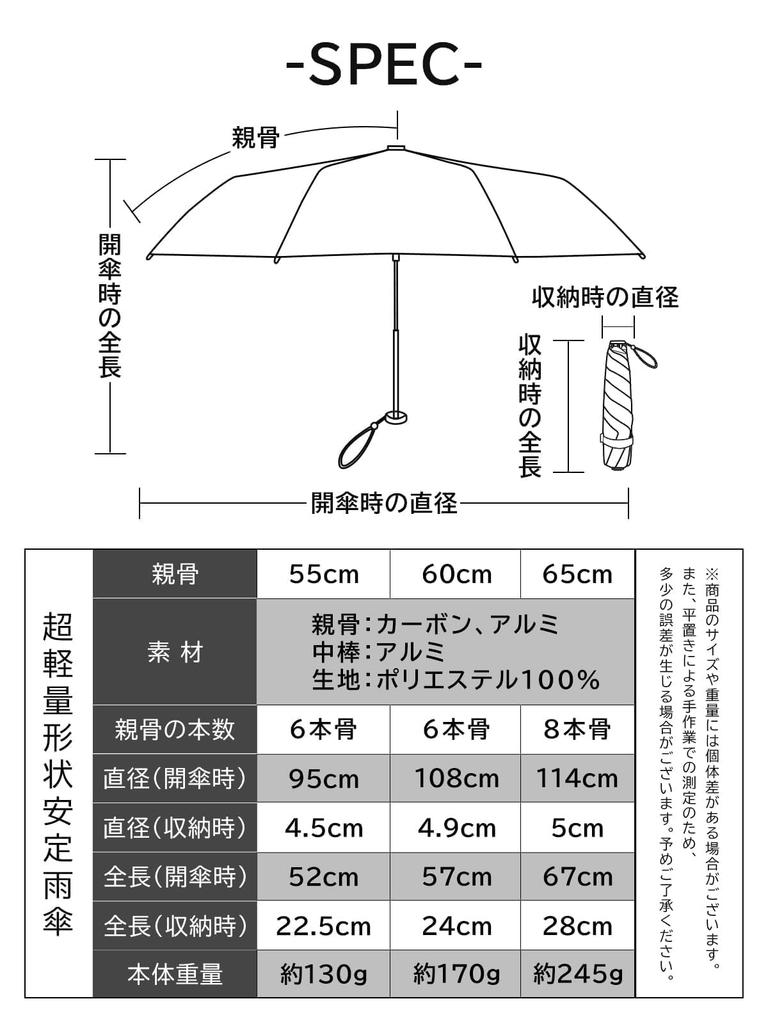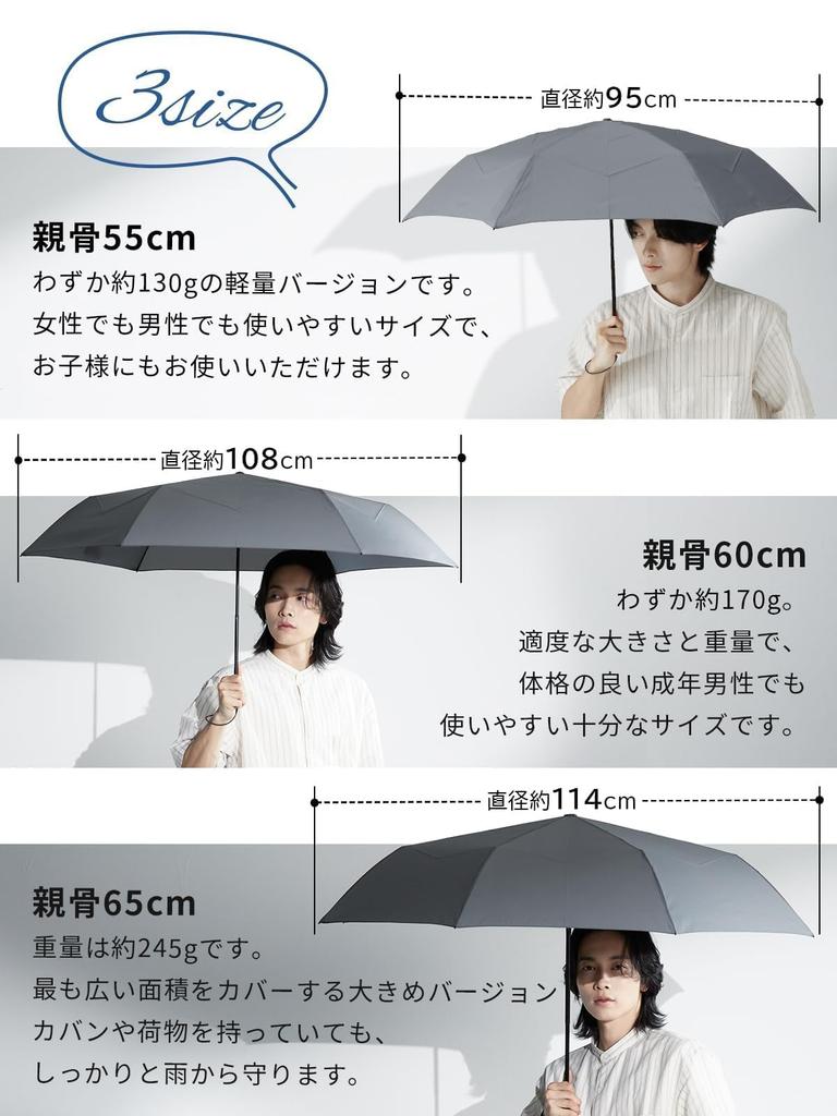 [Три размера для универсального использования] Доступны в трех размерах, идеально подходят для всей семьи. Идеальный как для детей, так и для взрослых, этот зонт избавляет от хлопот выбора зонта.. <55см ребра, 6 ребер> Весит примерно 130г, диаметр около 95см, в сложенном виде 22,5см. Идеально подходит как для мужчин, так и для женщин, включая детей. <60 см Спицы, 6 спиц> Весит примерно 170 г, диаметр около 108 см, в сложенном виде 24 см. Его умеренный размер и вес делают его удобным в использовании даже для взрослых людей крупного телосложения.. <65см спицы, 8 спиц> Весит всего 245 г, что делает его самым легким зонтом своего размера. Он имеет диаметр примерно 114 см и измеряет 28 см в сложенном виде.. Его широкое покрытие гарантирует, что ваши вещи останутся сухими даже под сильным дождем.. (Пожалуйста, обратите внимание, что возможны незначительные отклонения в цвете и изделии.)